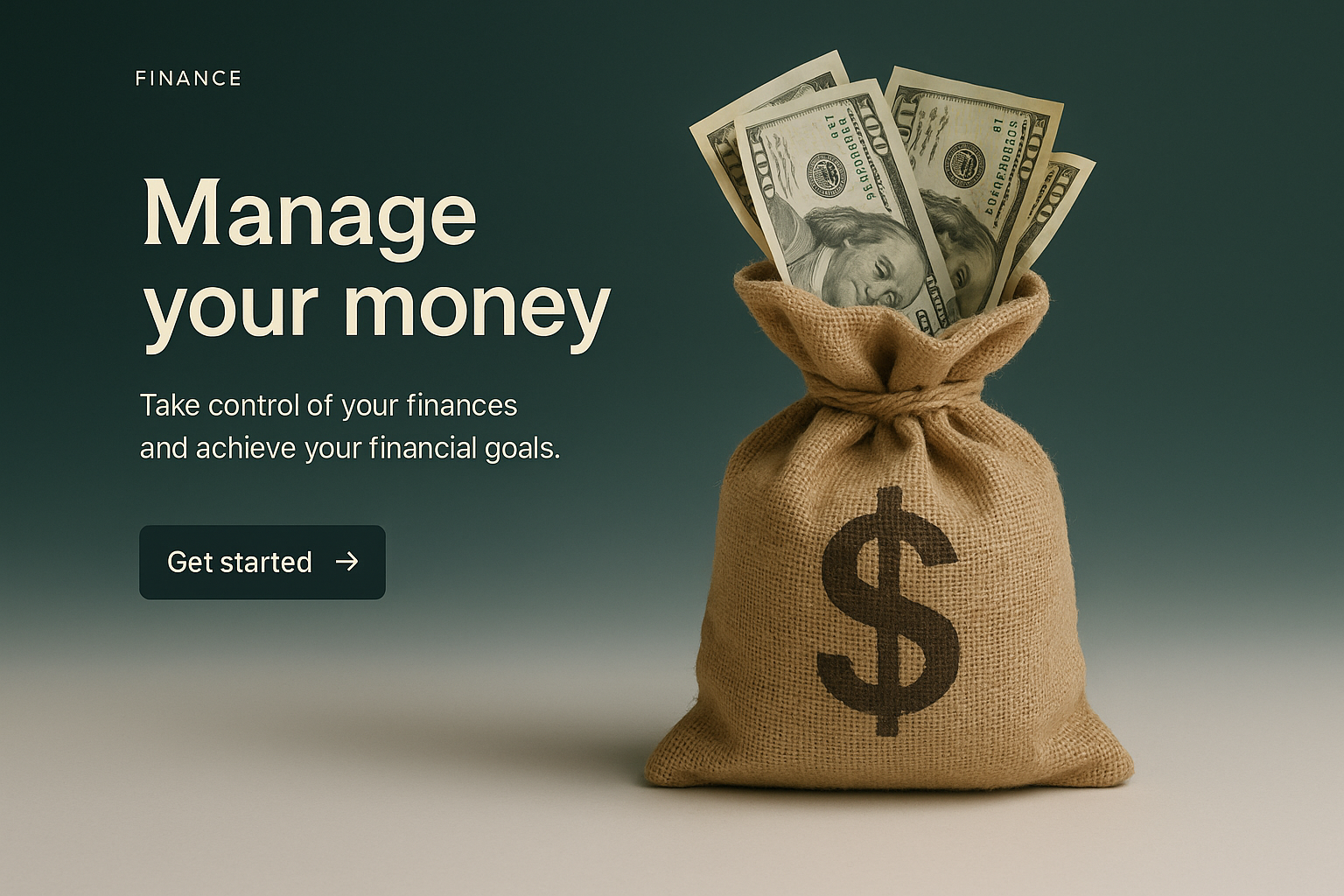 /Collection: /by davooda/Type: PNG/A realistic illustration of a money bag filled with cash, set against a gradient background. The design includes a call to action for managing finances, creating a modern and appealing look.