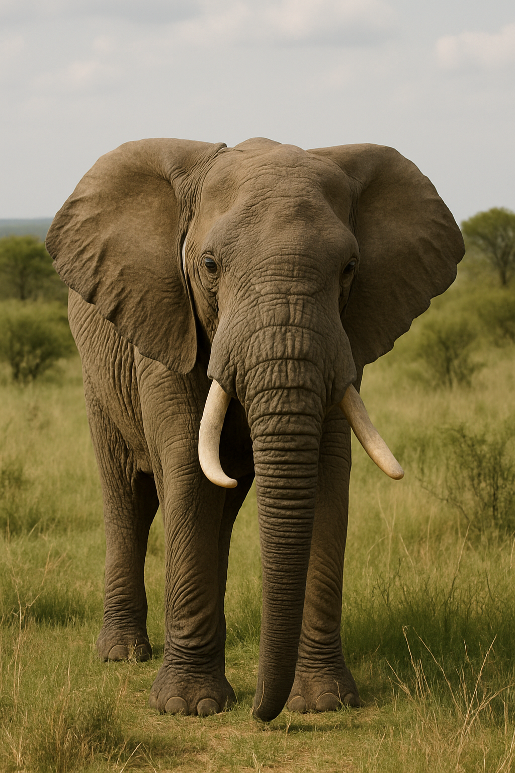 A striking close-up of an elephant standing in a lush green field, showcasing its grandeur and natural beauty. Ideal for wildlife photography enthusiasts and nature conservation campaigns.