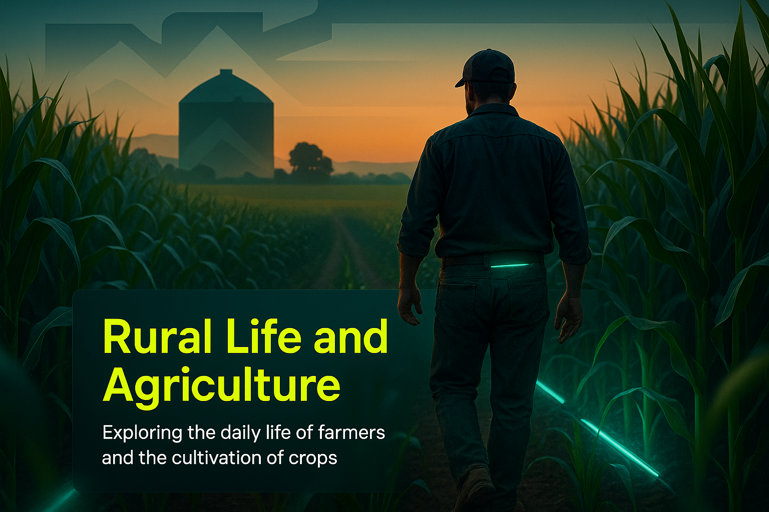 Engaging visual representation of rural life and agriculture, showcasing a farmer in a cornfield at dusk. Ideal for educational or promotional content related to farming and agriculture.