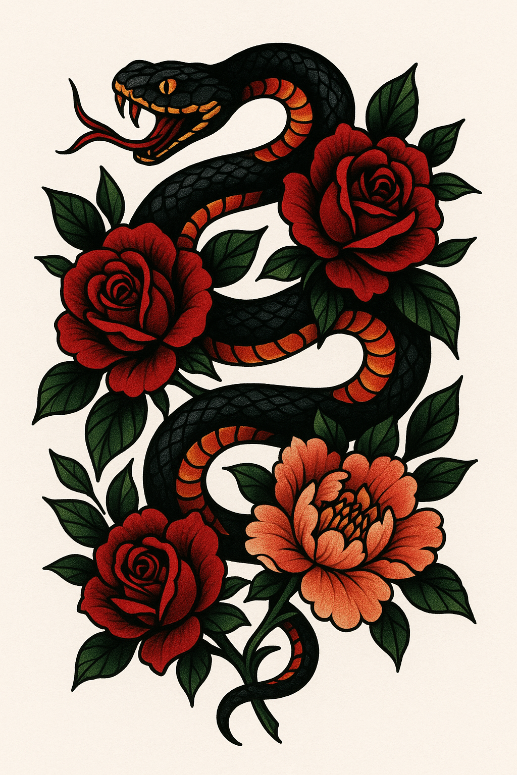 Vibrant traditional tattoo artwork showcasing a black snake entwined with bold red and peach roses. Ideal for tattoo enthusiasts or as design inspiration.
