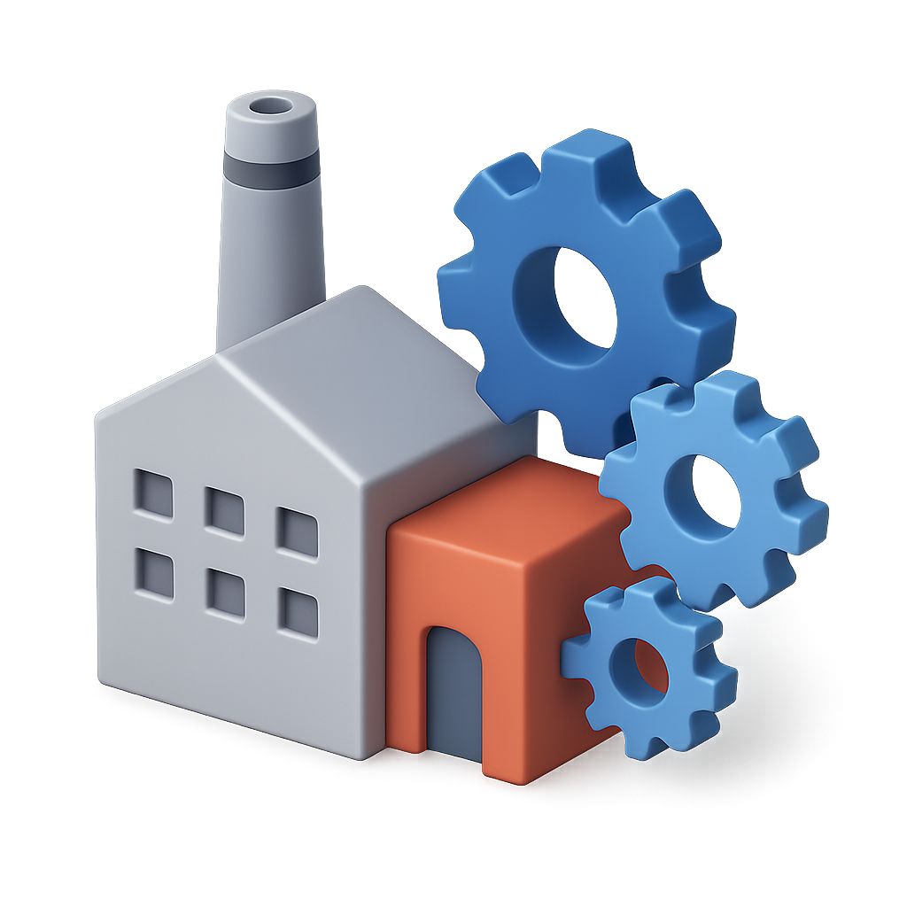 A vibrant 3D icon depicting a factory with a chimney and colorful gears. The structure features a three-quarter view, showcasing a blend of gray, orange, and blue elements, all set against a transparent background.