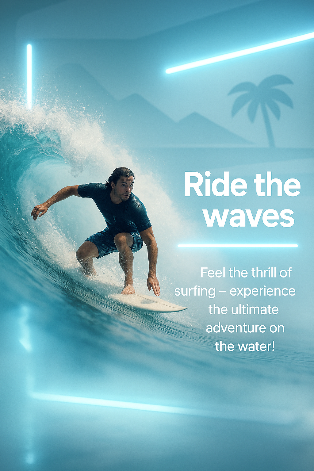 Dynamic Surfing Promotional Graphic Featuring a Surfer