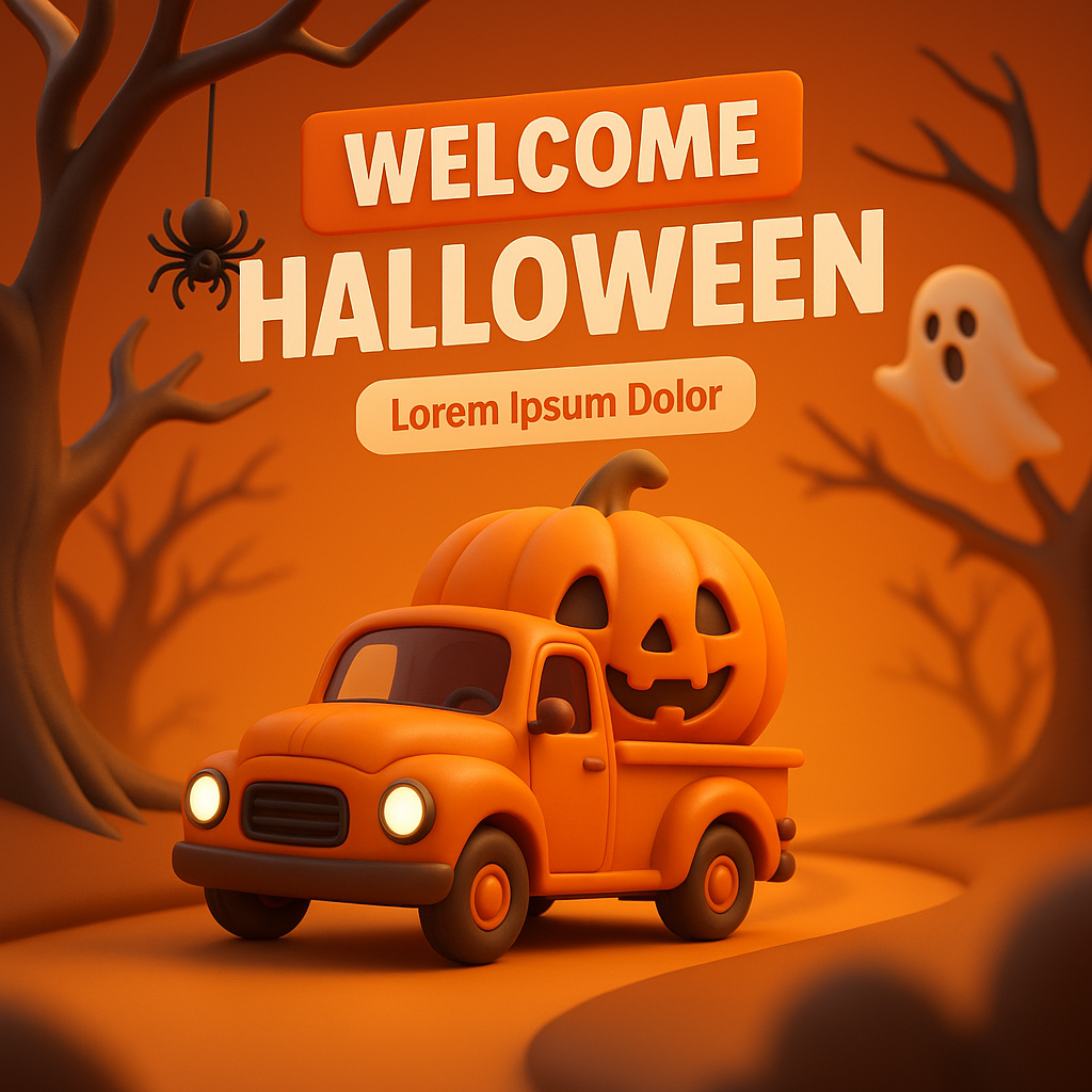 Colorful Halloween-themed illustration featuring a truck carrying a pumpkin, set in a spooky landscape. Ideal for festive promotions or social media posts.