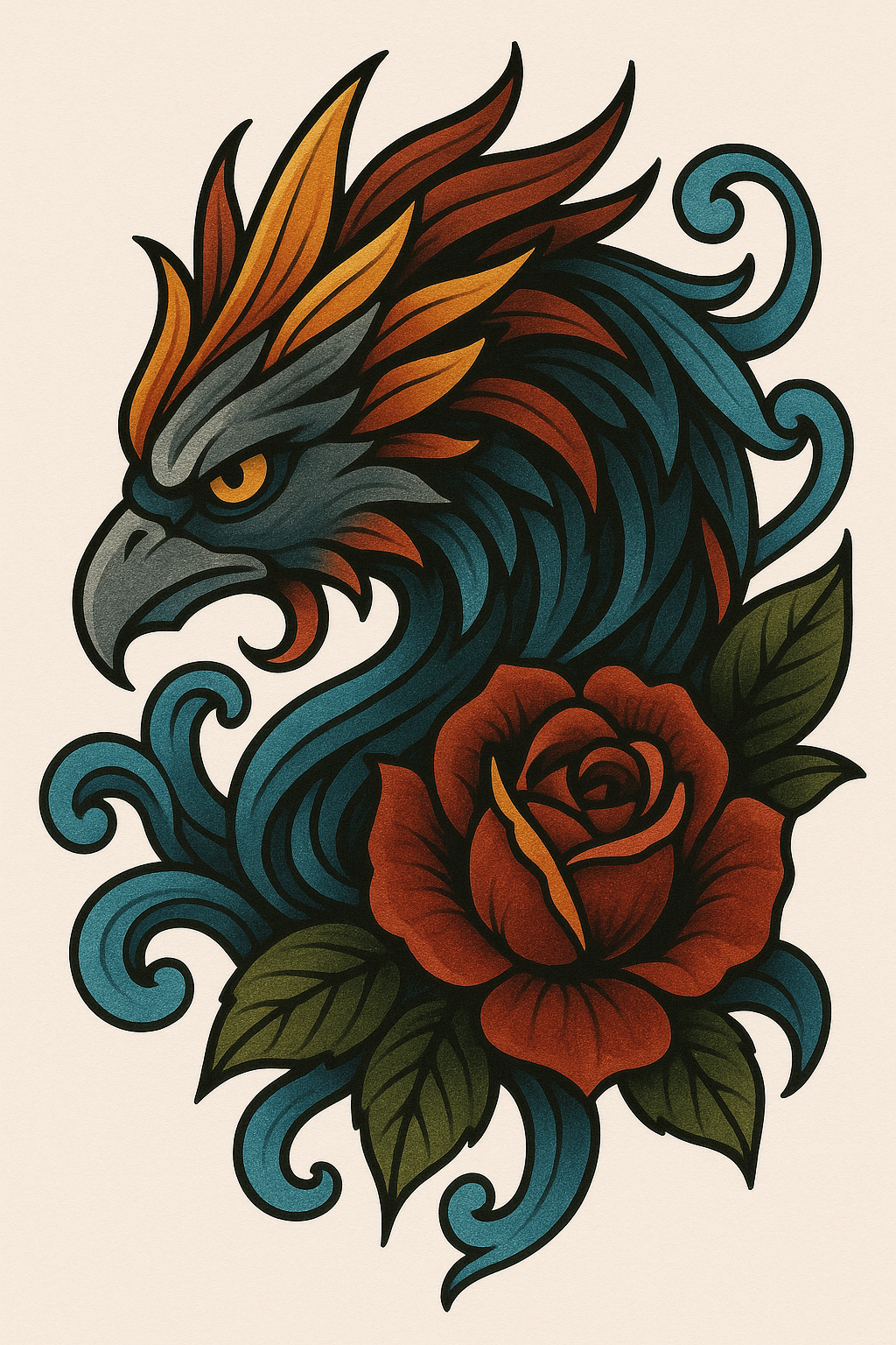 Stylized tattoo artwork featuring a phoenix entwined with a rose, showcasing bold colors and intricate line work. Ideal for tattoo inspiration and artistic expression.