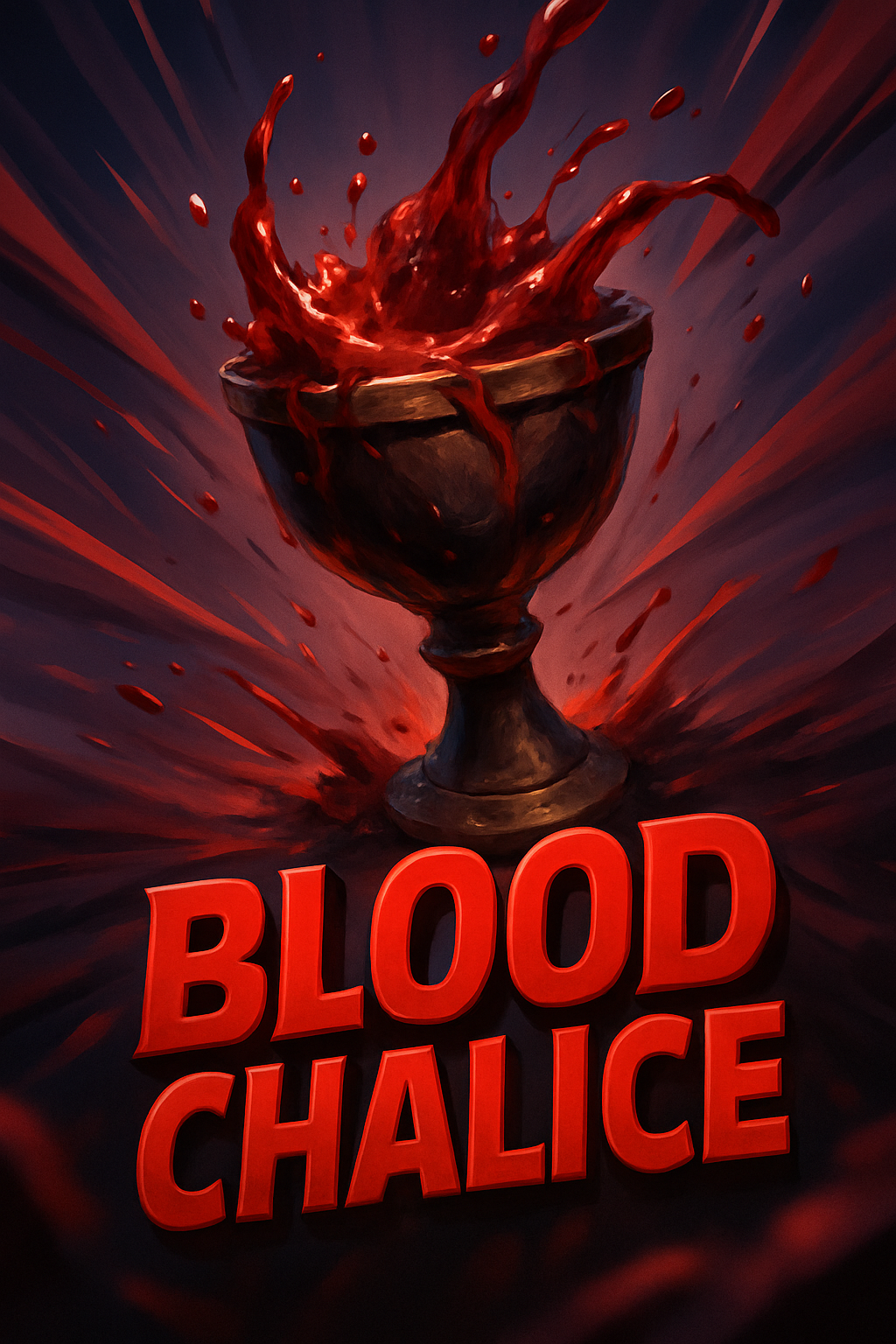 /Collection: /by davooda/Type: PNG/This striking illustration features a blood chalice with dynamic splashes of red liquid, set against a gradient background. The bold title 'BLOOD CHALICE' adds emphasis and energy to the composition.