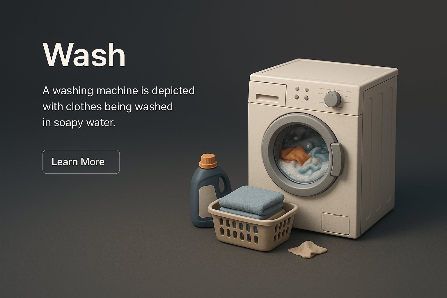 /Collection: /by davooda/Type: PNG/A realistic 3D depiction of a washing machine with clothes in soapy water. The scene features a dark gradient background and a prominent text block with a call-to-action.