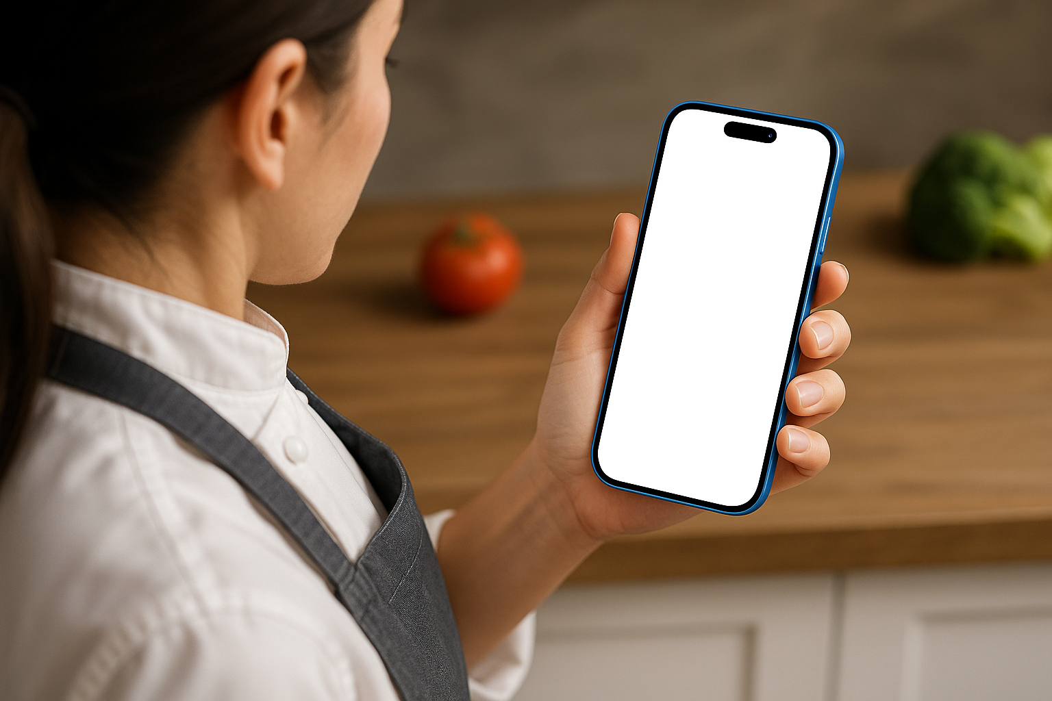 A woman chef in an apron holds a blue phone with a blank screen above a kitchen counter. The shot captures her from behind, creating a dynamic and engaging scene.
