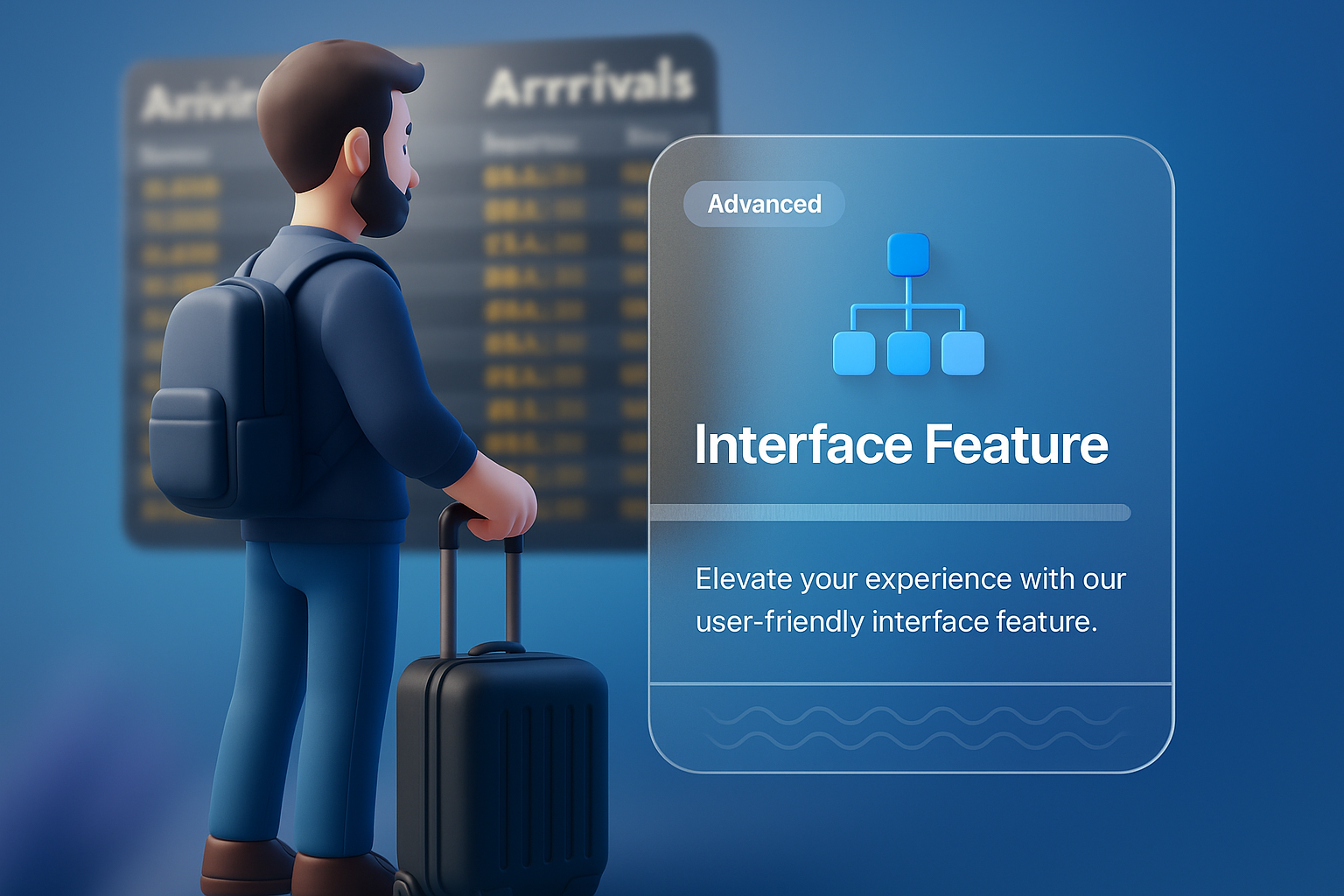 A 3D illustration of a man standing at an airport terminal, holding a suitcase. The focus is on the traveler against a blurred arrival and departure board, showcasing anticipation for travel.