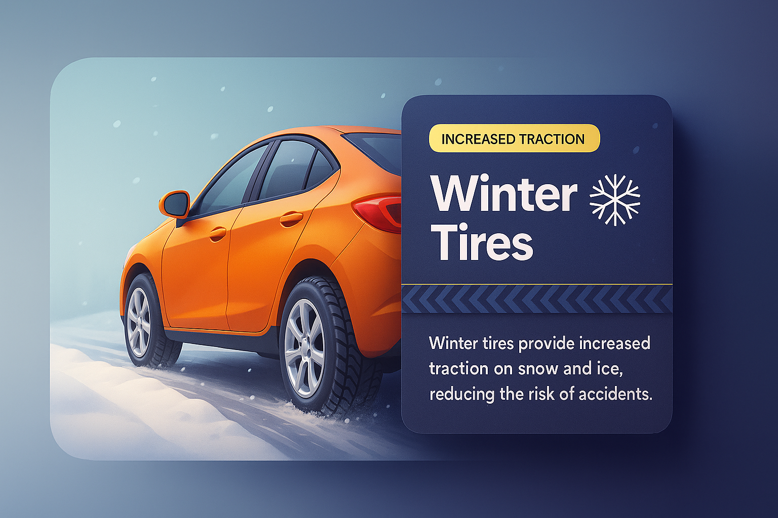 A side view of an orange car equipped with winter tires on a snowy road. The car is depicted against a soft gradient background, emphasizing its features and winter readiness.