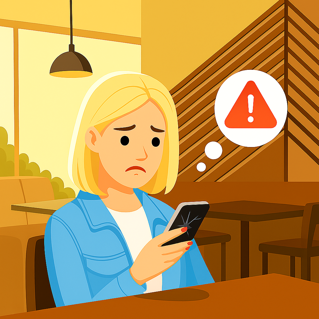 /Collection: /by davooda/Type: PNG/A digital illustration depicting a worried individual checking their phone, set in a cozy café environment. The warm color palette and simple design convey a relatable emotional moment, suitable for mental health discussions or tech-related content.