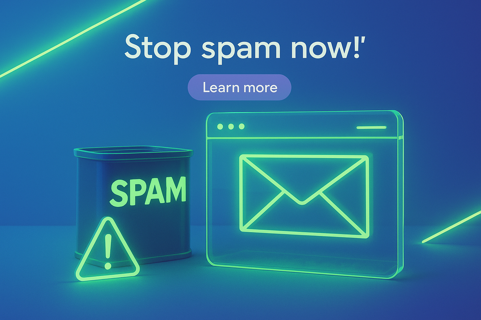 /Collection: /by davooda/Type: PNG/A visually striking composition featuring neon elements related to spam, including a glowing message, an envelope, and a warning sign, all set against a solid blue background.