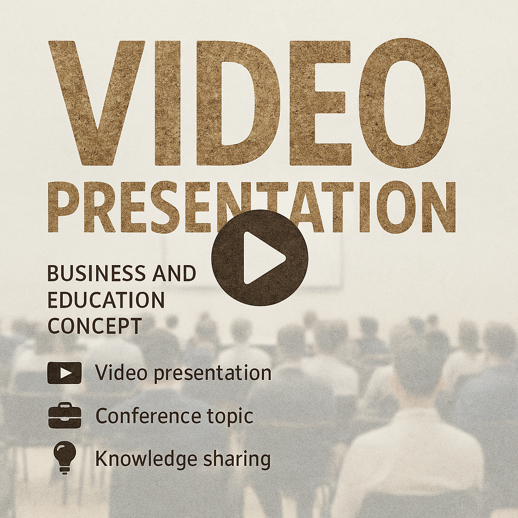 /Collection: /by davooda/Type: PNG/A graphic depicting a video presentation setup in a business or educational context, featuring a play button and relevant icons. Ideal for promoting online learning or conference topics.