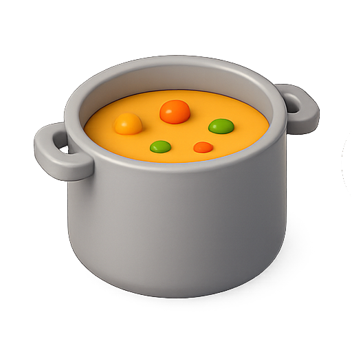 A vibrant, cartoon-style cooking pot filled with colorful soup, featuring playful round vegetables. Ideal for culinary-themed graphics or children's content.