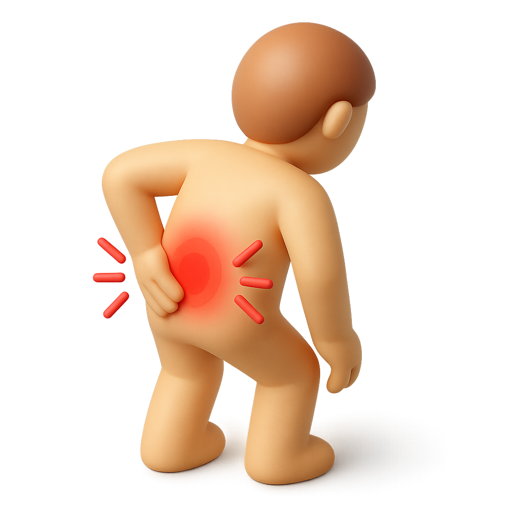 A 3D icon depicting a figure in a three-quarter view, highlighting back pain with a red circular indicator. The design features a smooth, volumetric look against a soft gradient background.
