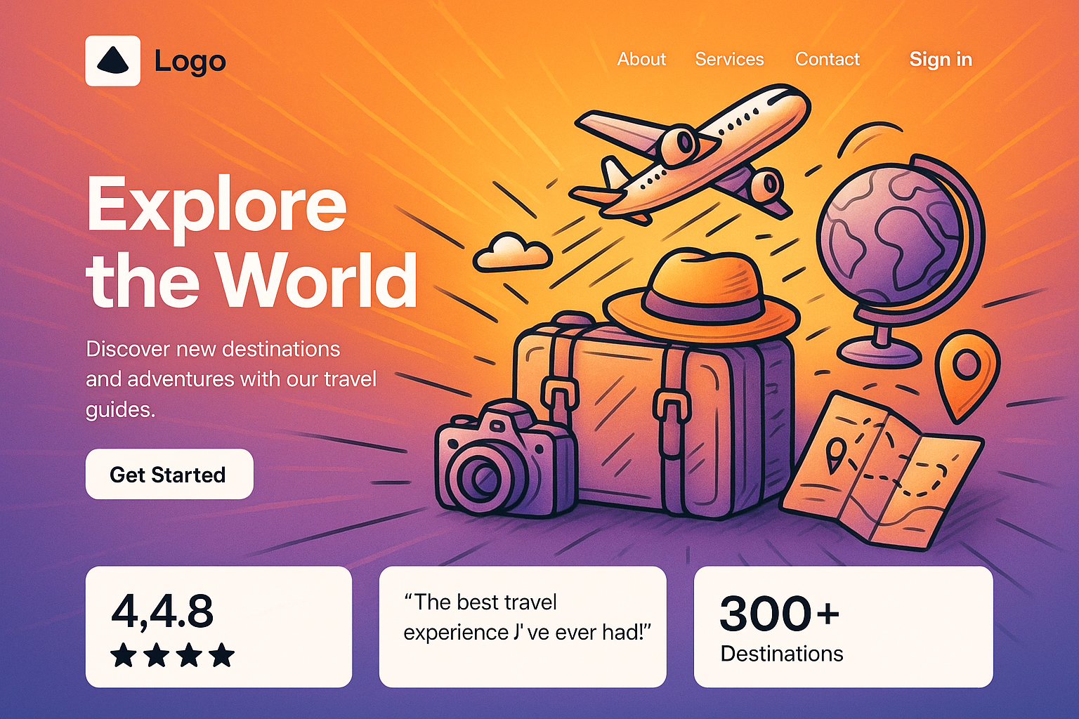 A vibrant 3D landing page design featuring travel elements like a globe, suitcase, and airplane. The layout includes ratings, testimonials, and a call-to-action button.