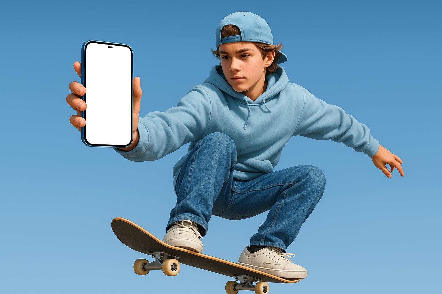 A teen skateboarder is captured mid-jump, holding a blue smartphone with a white screen. He wears a light blue hoodie and denim jeans, showcasing a dynamic action pose against a clear blue sky.