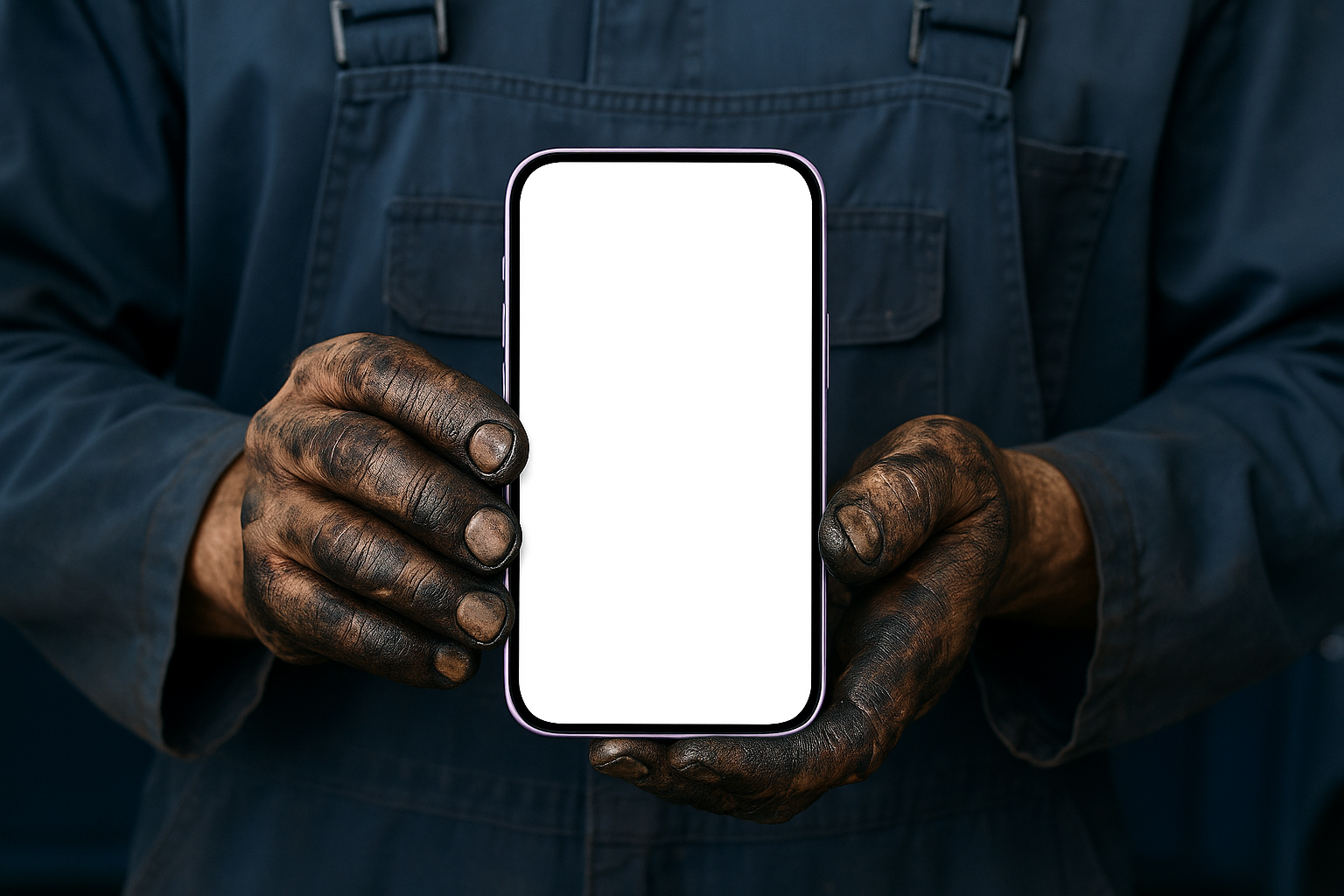 A mechanic in a blue work uniform holds a purple phone with a blank screen, displaying oily hands that indicate his work environment. The phone features rounded edges.