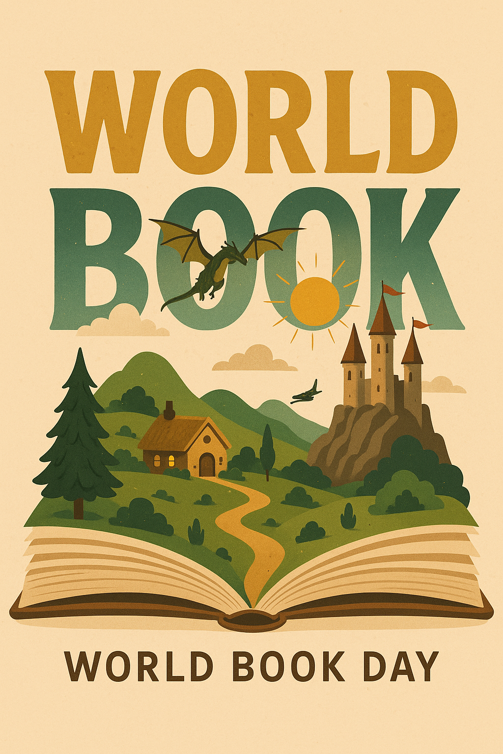 /Collection: /by davooda/Type: PNG/A vibrant and whimsical poster celebrating World Book Day, featuring an open book with a fantasy landscape, castles, and mythical elements. Ideal for educational and literary events.