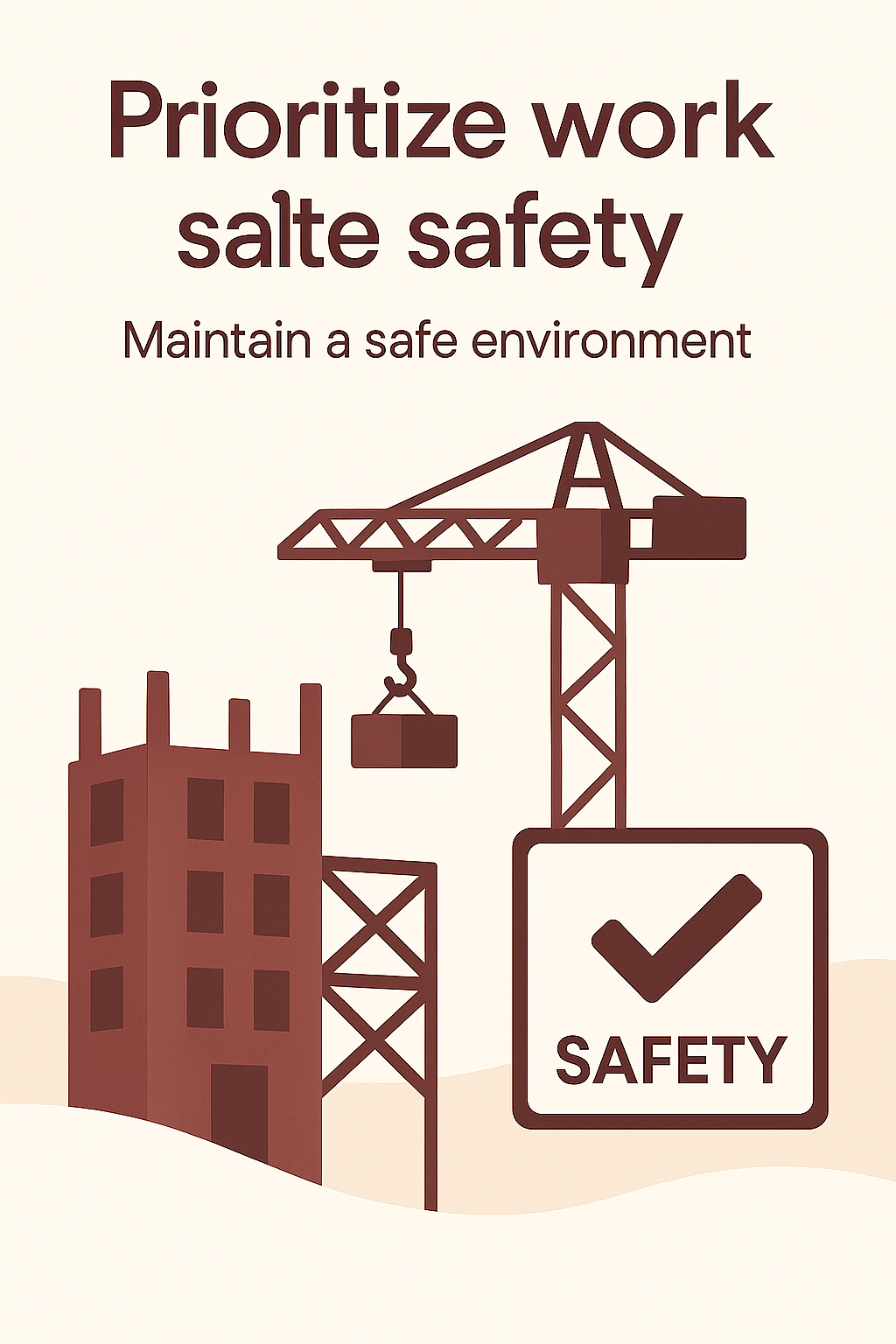 Informative graphic promoting safety in construction environments, featuring a crane and a checklist. Designed for workplace safety campaigns.