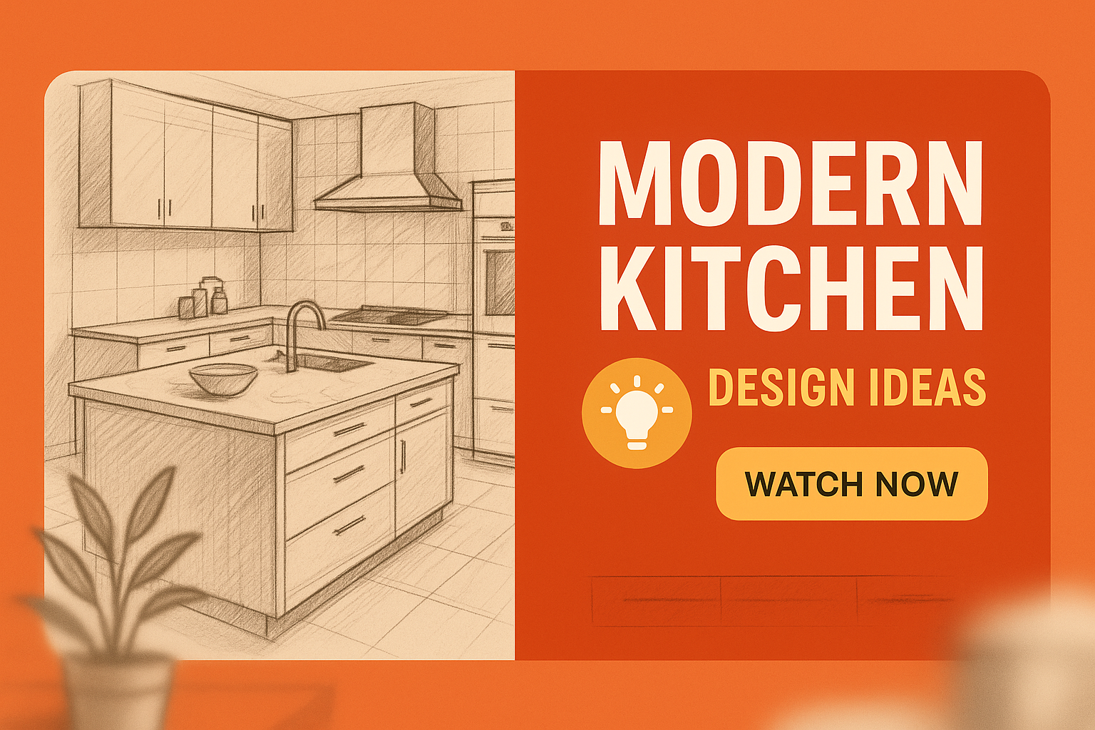 Promotional graphic showcasing modern kitchen design ideas with a sketched illustration, perfect for engaging an audience interested in home renovation and interior design.