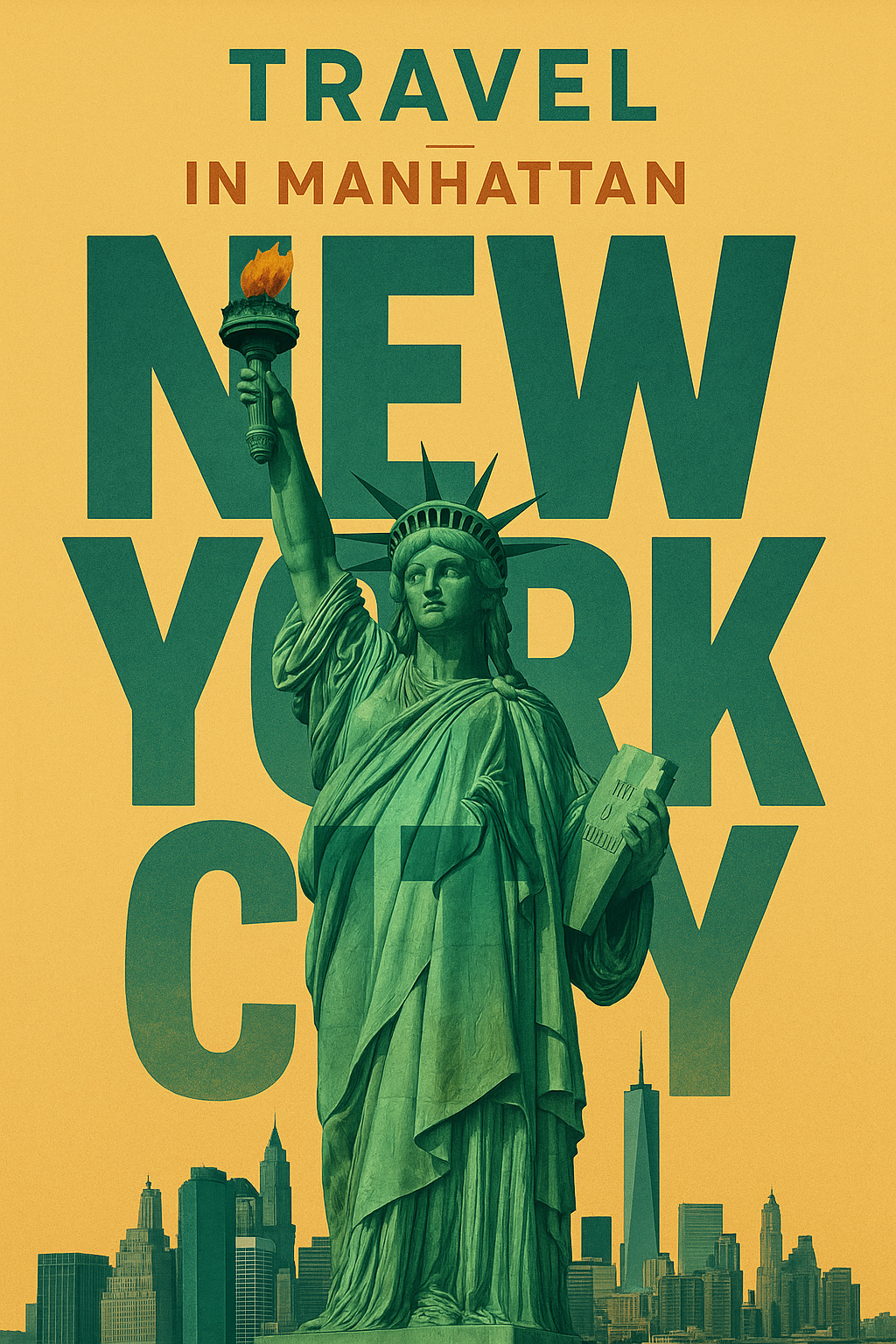 /Collection: , /by davooda/Type: PNG/A vibrant travel poster showcasing the Statue of Liberty against a stylized city skyline, emphasizing tourism in Manhattan. Ideal for travel enthusiasts and tourism promotion.