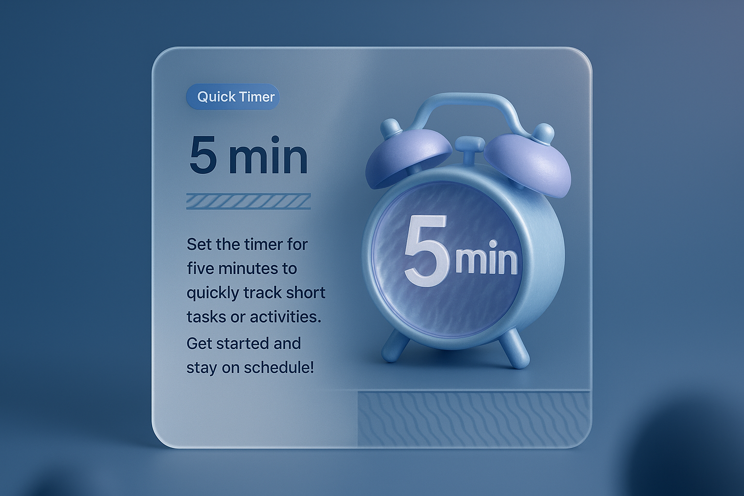 A visually striking 3D illustration of a timer set to five minutes. The design features a glass-like block with integrated graphics, presenting a modern and cohesive look.