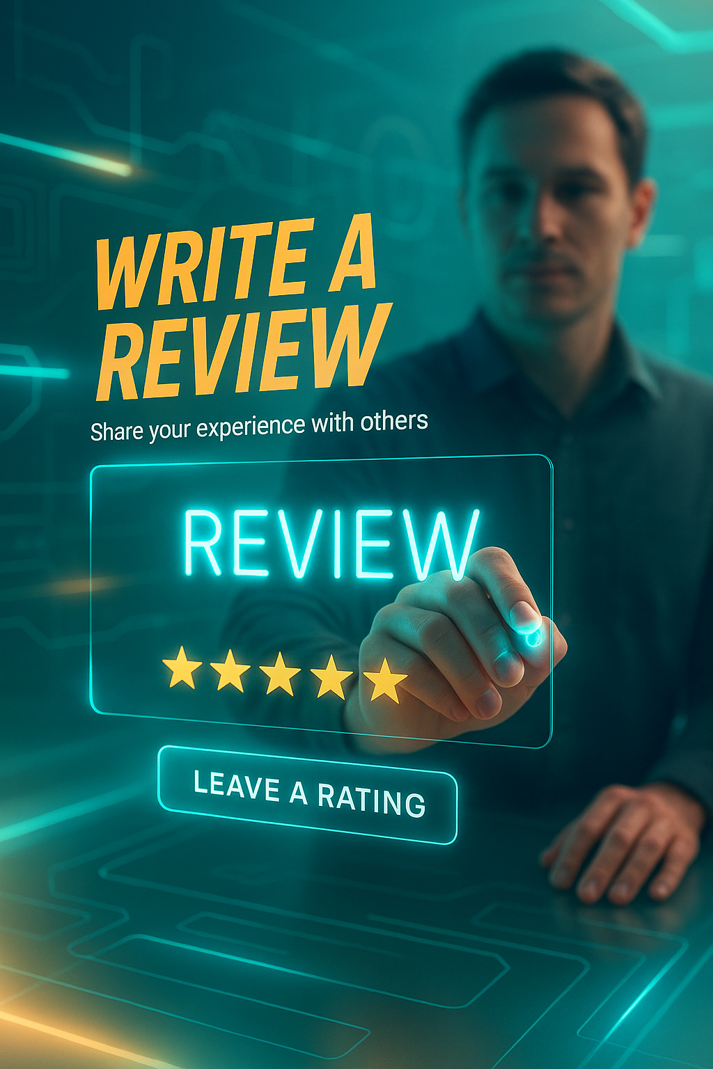 /Collection: /by davooda/Type: PNG/Futuristic digital graphic depicting a user interacting with a review submission interface, ideal for applications or websites encouraging user feedback.