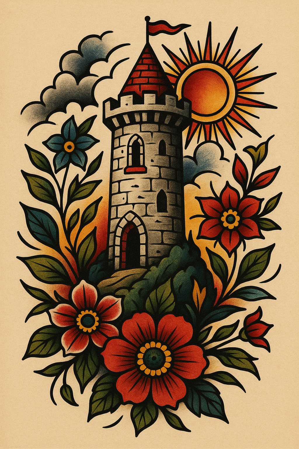Colorful Tattoo-Style Tower Illustration with Flowers and Sun