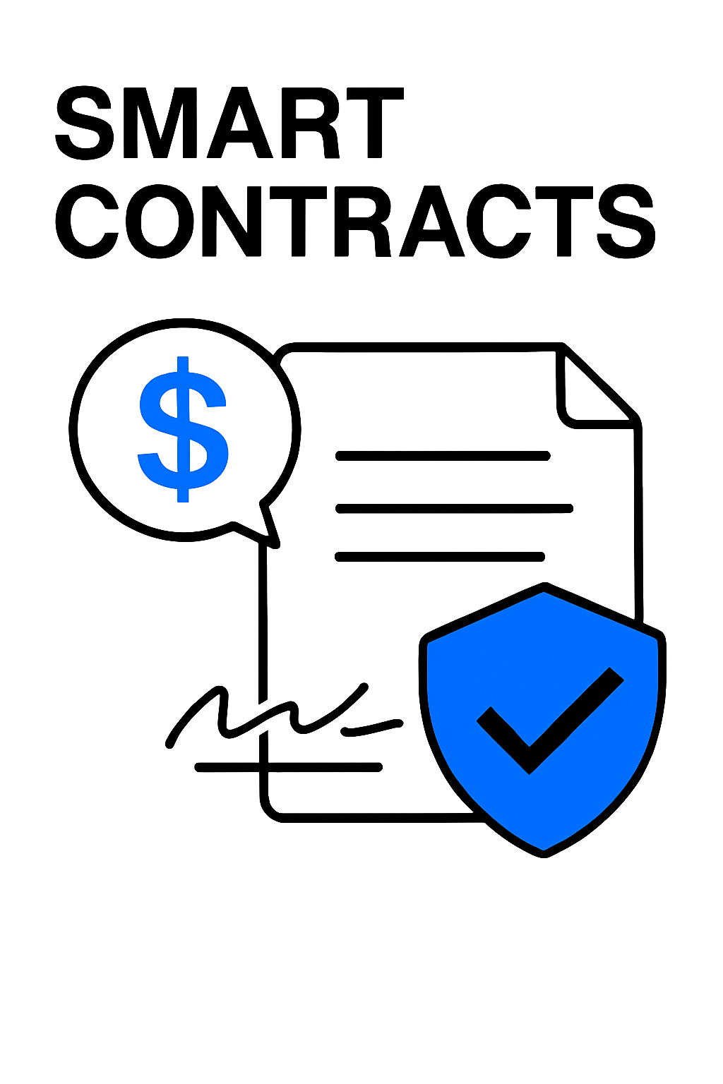 A modern graphic illustrating smart contracts, featuring a dollar sign and a shield symbol, suitable for educational content on blockchain technology.