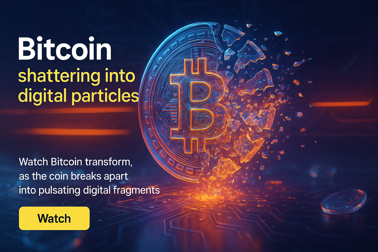 /Collection: /by davooda/Type: PNG/A visually striking digital graphic depicting Bitcoin shattering into vibrant particles. Ideal for cryptocurrency-related promotions or educational content.