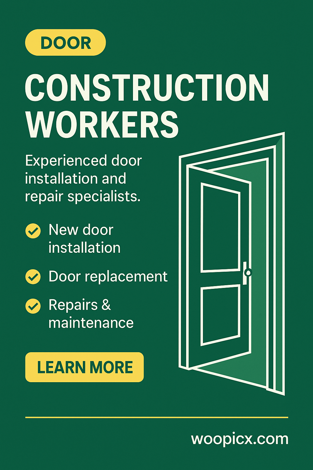 Informative advertisement showcasing door construction services with a clean and modern design, aimed at homeowners seeking installation and repair solutions.