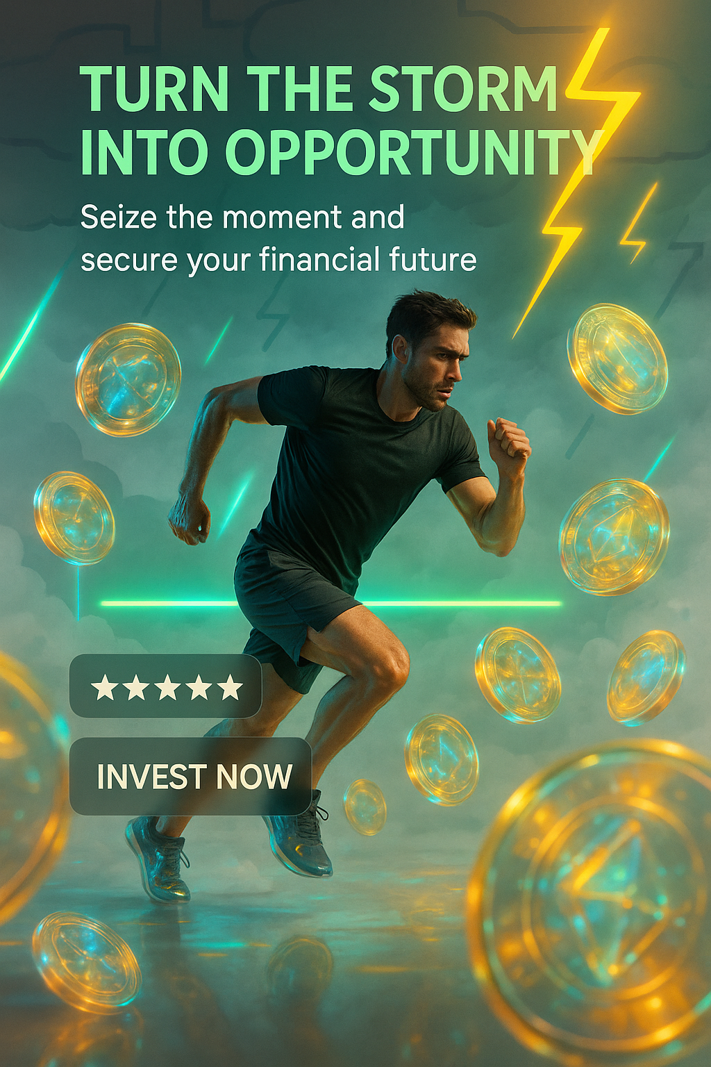 /Collection: /by davooda/Type: PNG/A vibrant promotional graphic encouraging investment, featuring a runner amidst swirling coins and lightning effects, ideal for financial marketing campaigns.