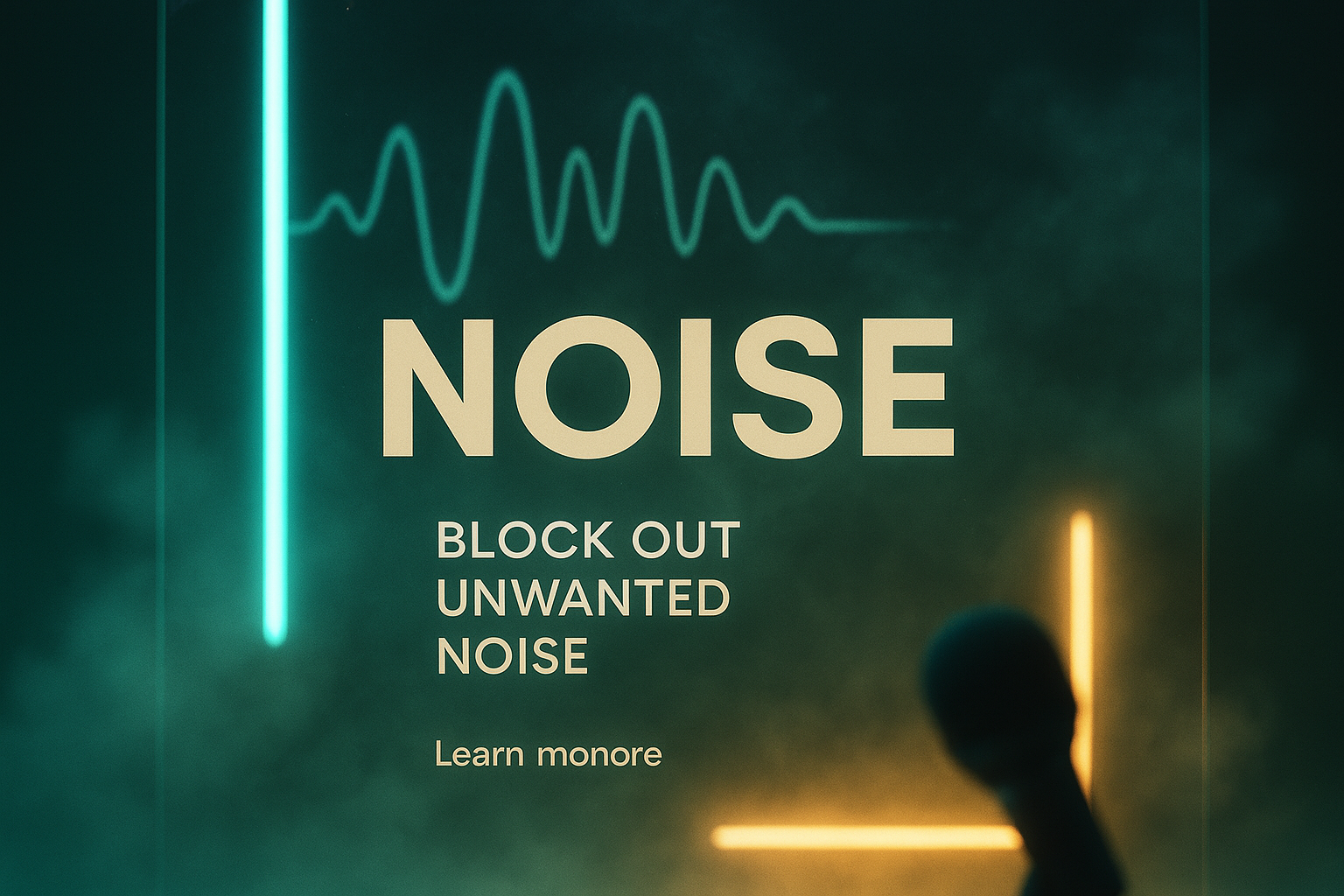This image showcases a neon-themed advertisement about noise reduction. It features glowing accents, layered text, and a foggy background, creating a captivating visual appeal.