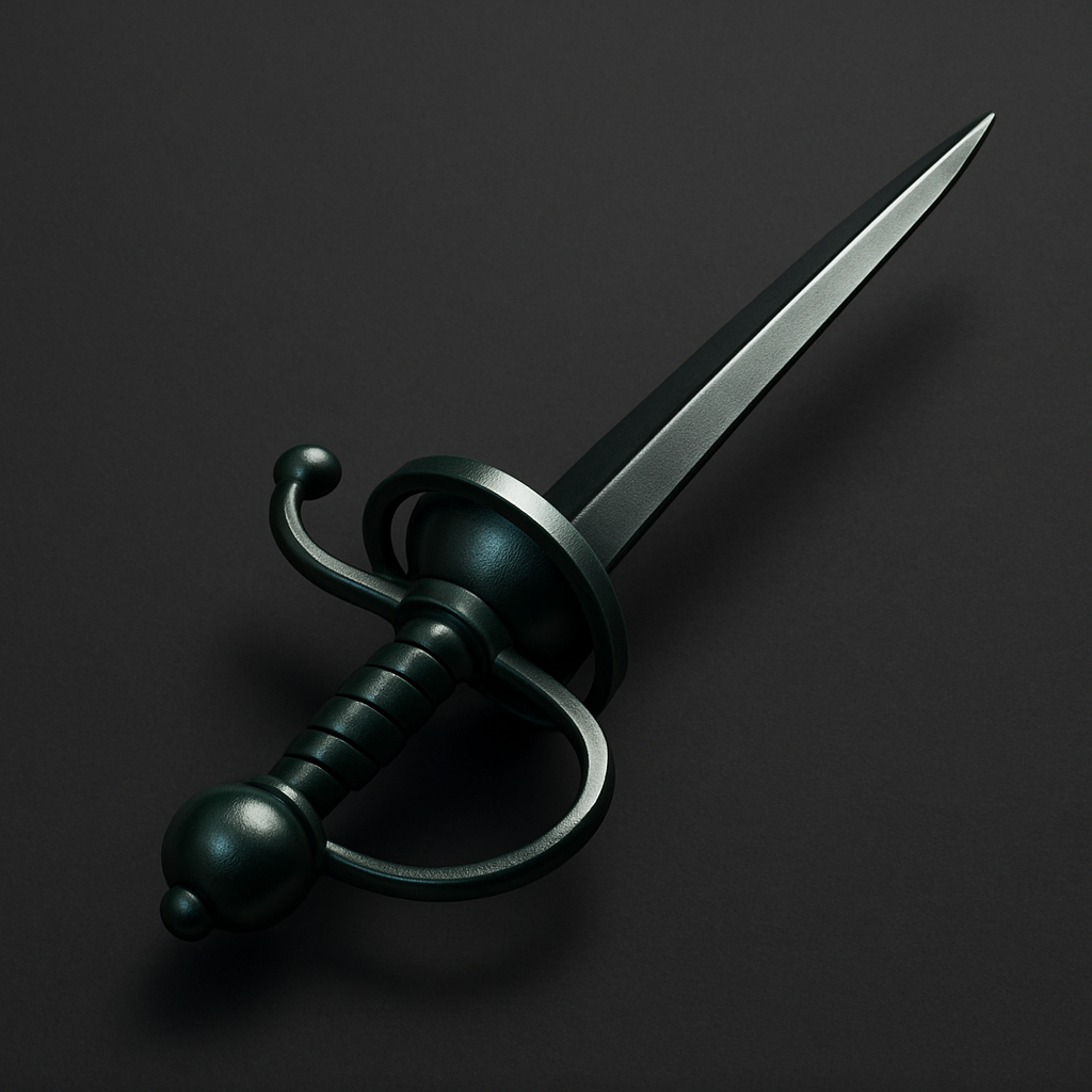 A high-detail 3D illustration of a rapier, depicted from a three-quarter view. The rapier features a green-black color scheme against a black background, enhanced by soft shadows.
