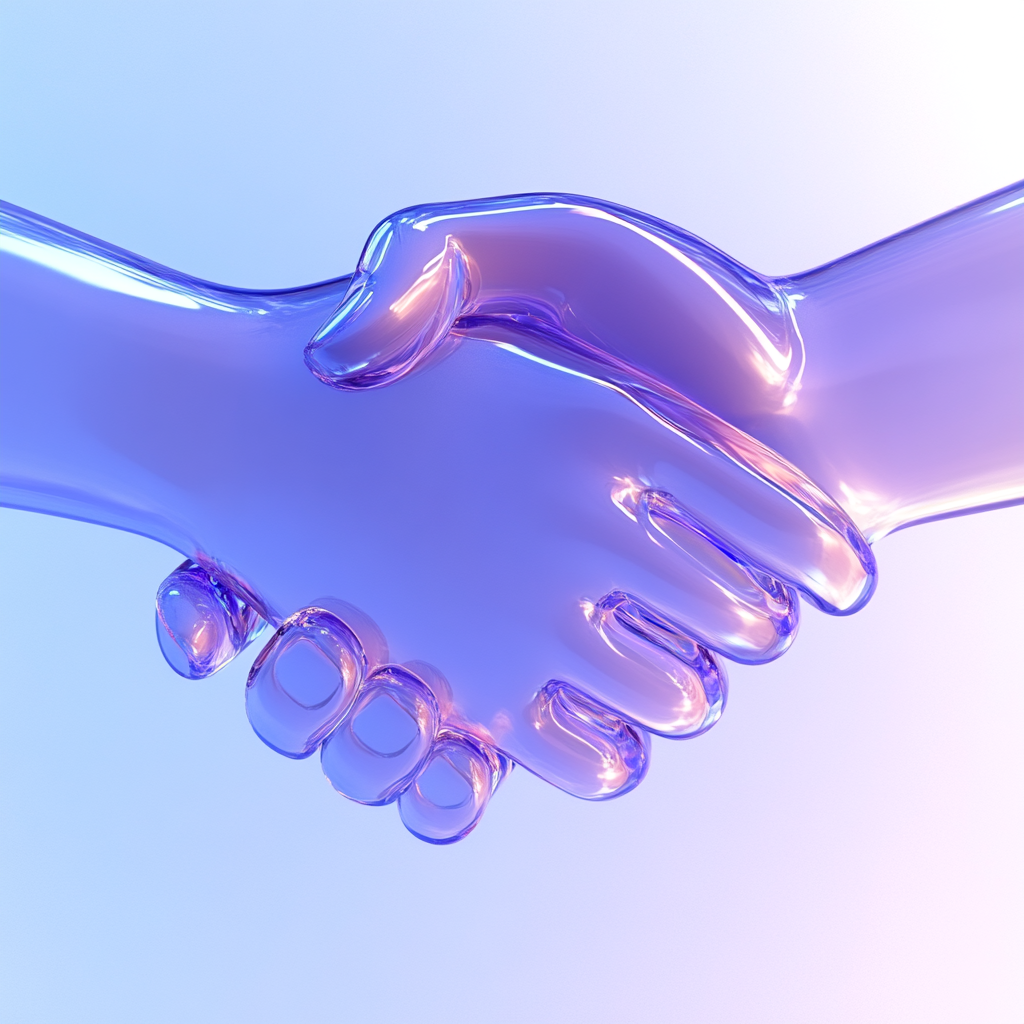 A visually striking 3D graphic depicting a handshake between two translucent hands, symbolizing agreement and collaboration. Ideal for business and partnership contexts.