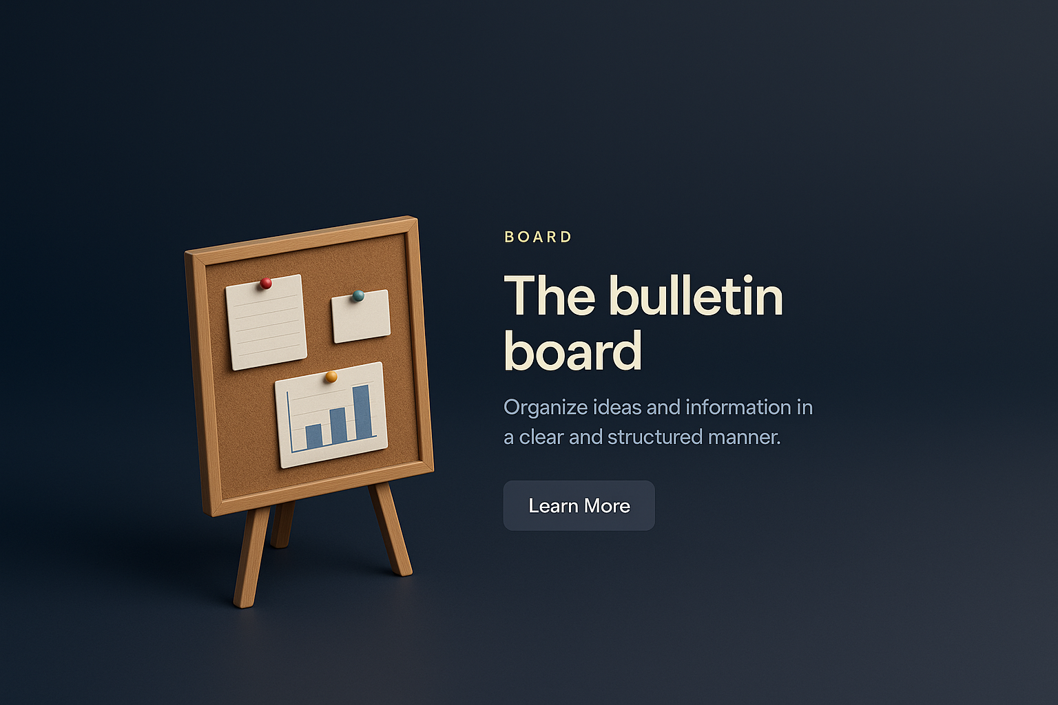 A small 3D scene featuring a bulletin board with notes and a graph against a dark background. The design emphasizes clarity and structure, suitable for showcasing ideas.