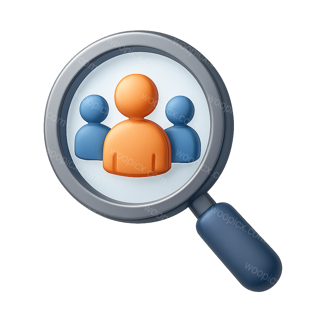 /Premium/Collection: /by davooda/Type: PNG/A 3D icon depicting a magnifying glass with three stylized figures underneath it. The central figure is orange while the others are blue, set against a soft gradient background.