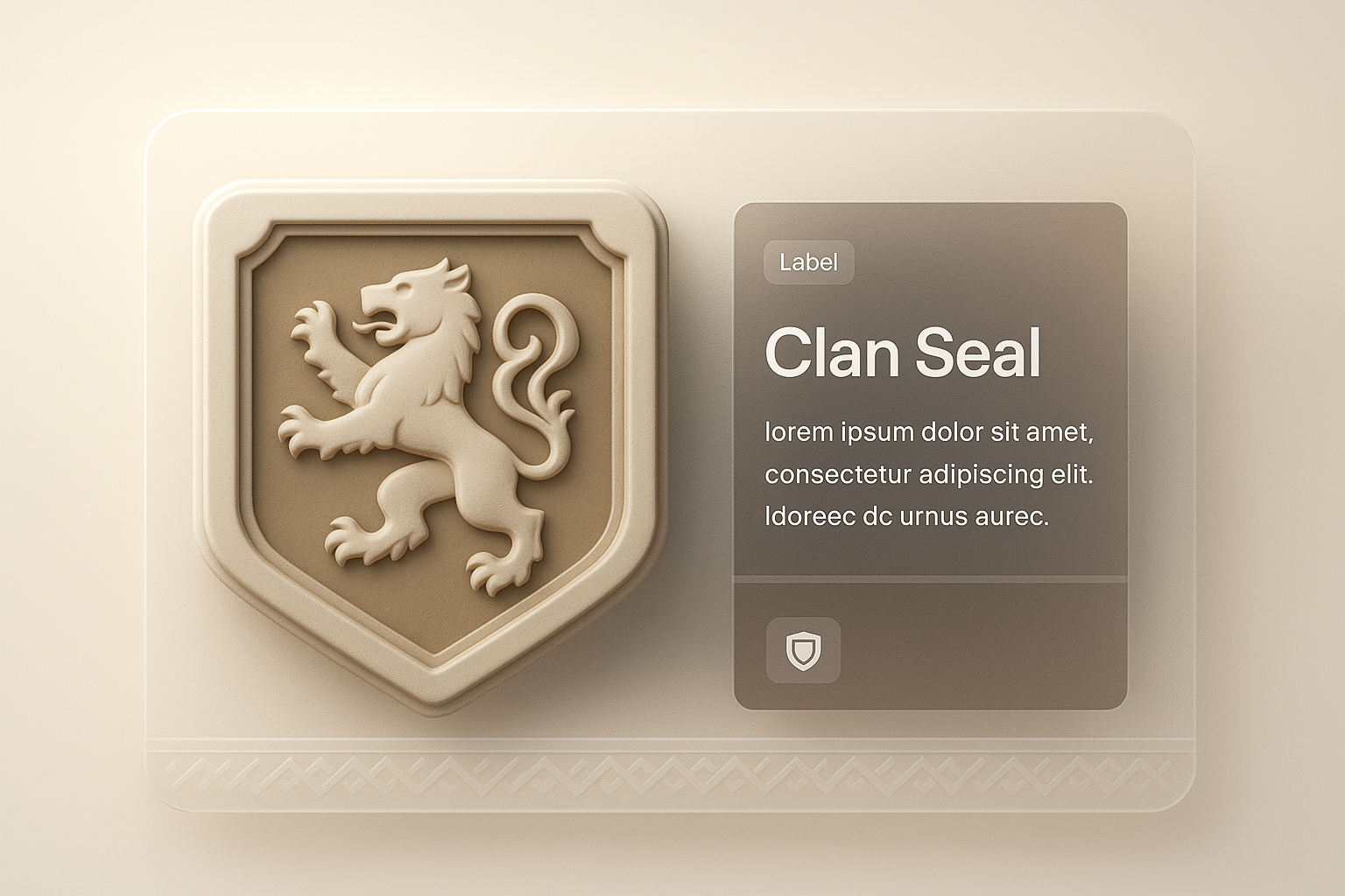 A 3D representation of a clan seal featuring a lion emblem on a smooth gradient background. Text overlays are designed for clarity and aesthetic appeal.
