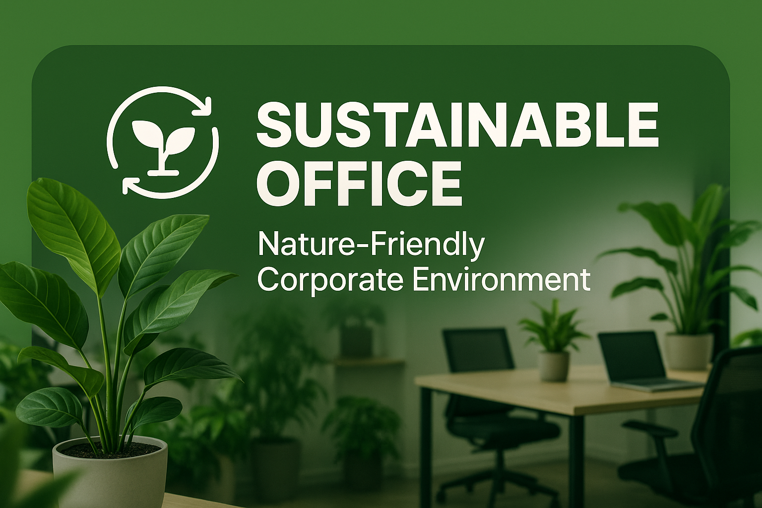 A promotional image depicting a sustainable office environment featuring greenery and modern design, ideal for marketing eco-friendly workplace solutions.