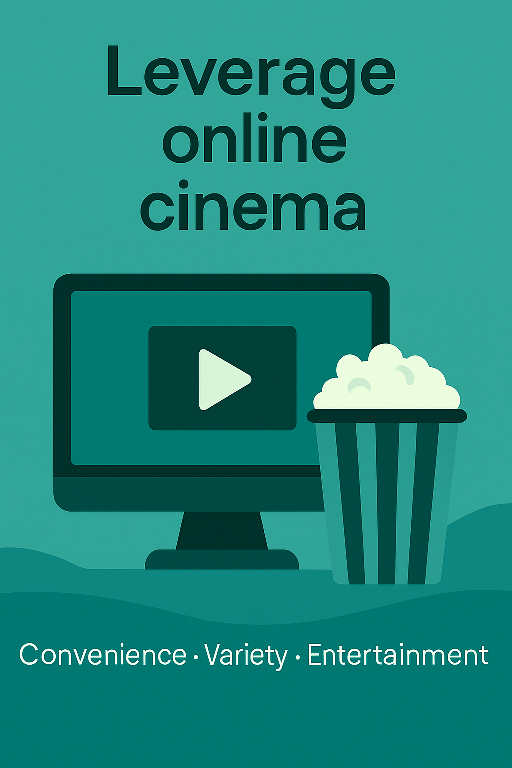Modern promotional graphic highlighting the benefits of online cinema, featuring a computer monitor and popcorn, ideal for digital marketing campaigns.