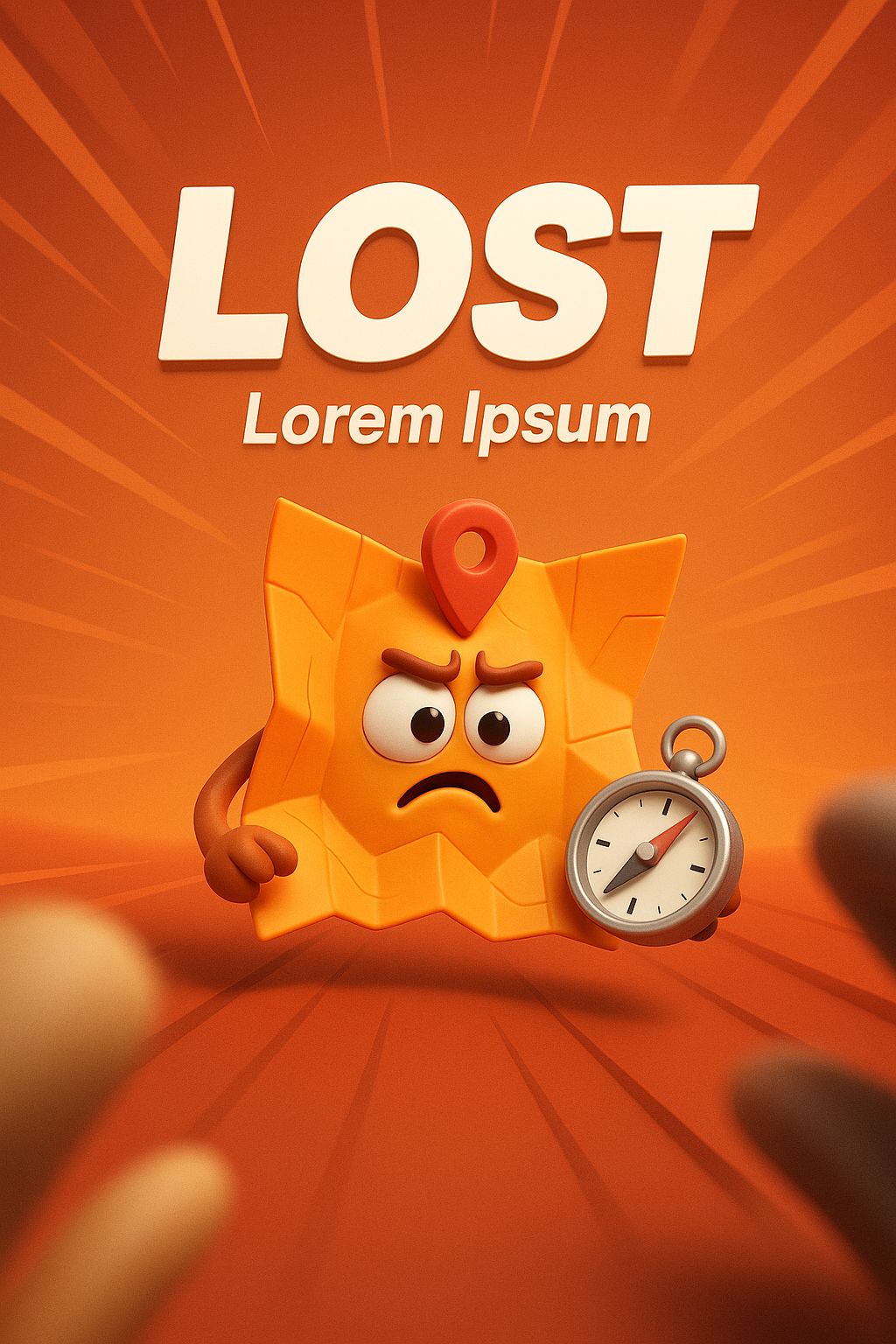 /Collection: /by davooda/Type: PNG/This image features a cartoon-style character resembling a map with a worried expression, holding a clock. The bright orange background and playful design suggest it's for a children's game or app.