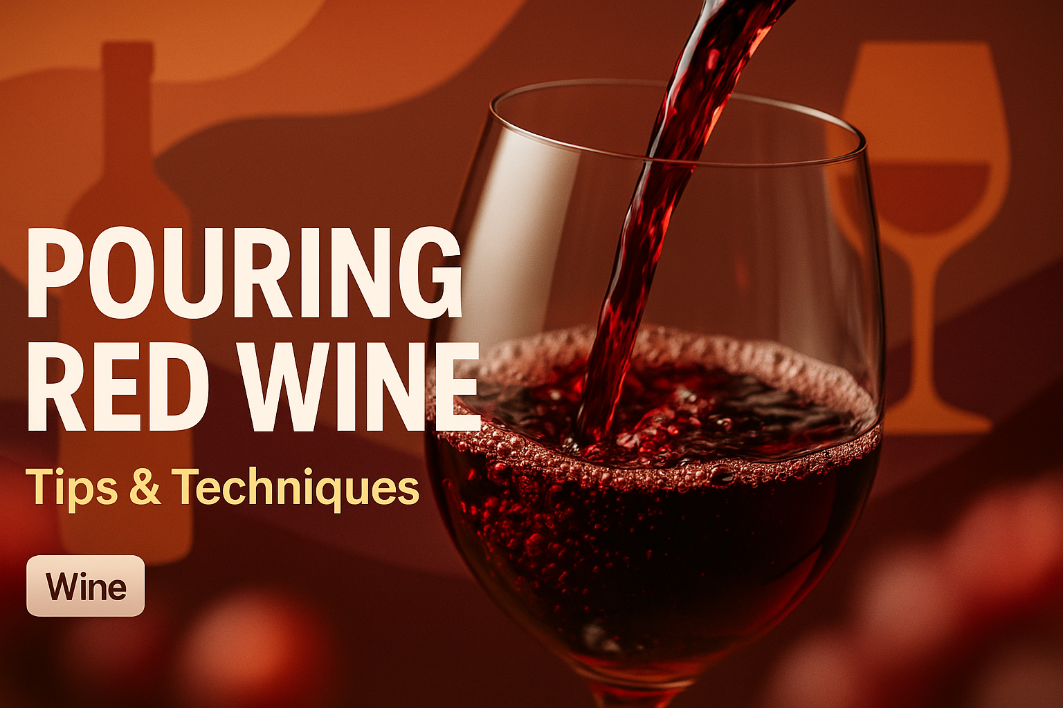 Stylish graphic showcasing the pouring of red wine, featuring tips and techniques. Ideal for educational content or promotional material in the wine industry.