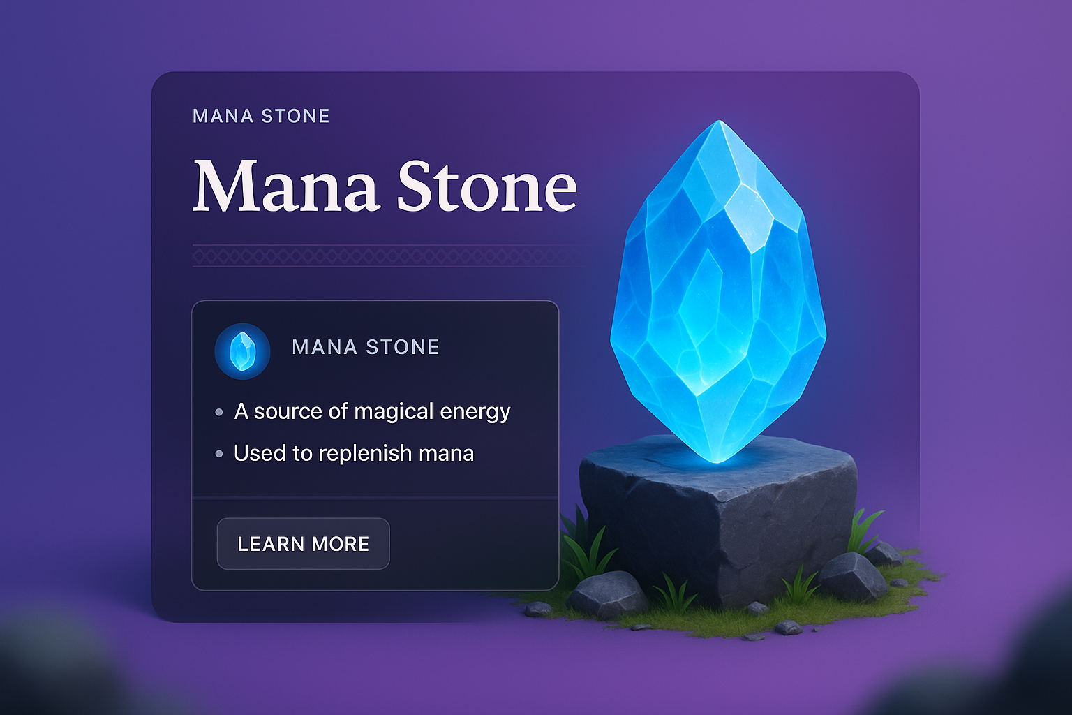 /Collection: /by davooda/Type: PNG/This image features a 3D illustration of a glowing mana stone set on a rock, complemented by a dark overlay that includes descriptive text and a call to action.