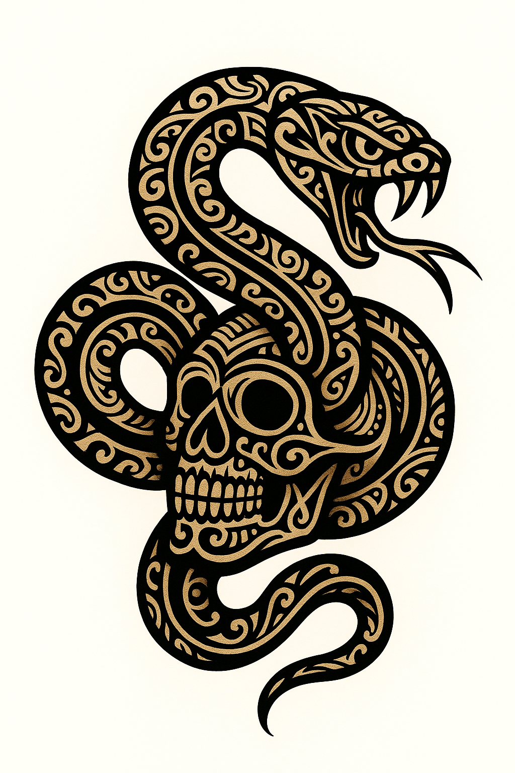 A striking graphic design featuring a snake coiling around a skull, adorned with intricate patterns. Ideal for tattoo art, merchandise, and dark-themed aesthetics.