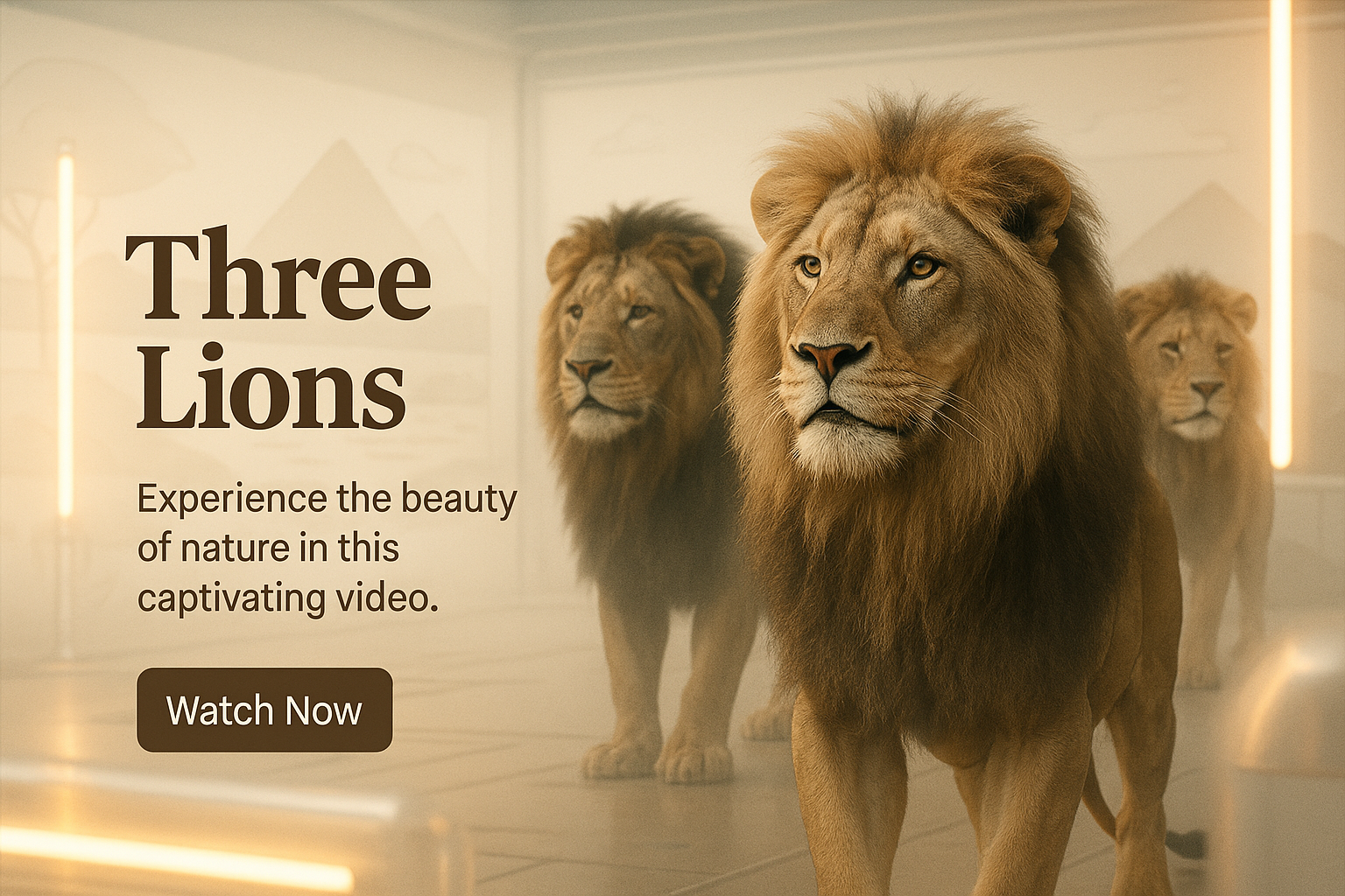 Engaging video thumbnail showcasing three lions in a serene environment, designed to attract viewers interested in nature and wildlife content.