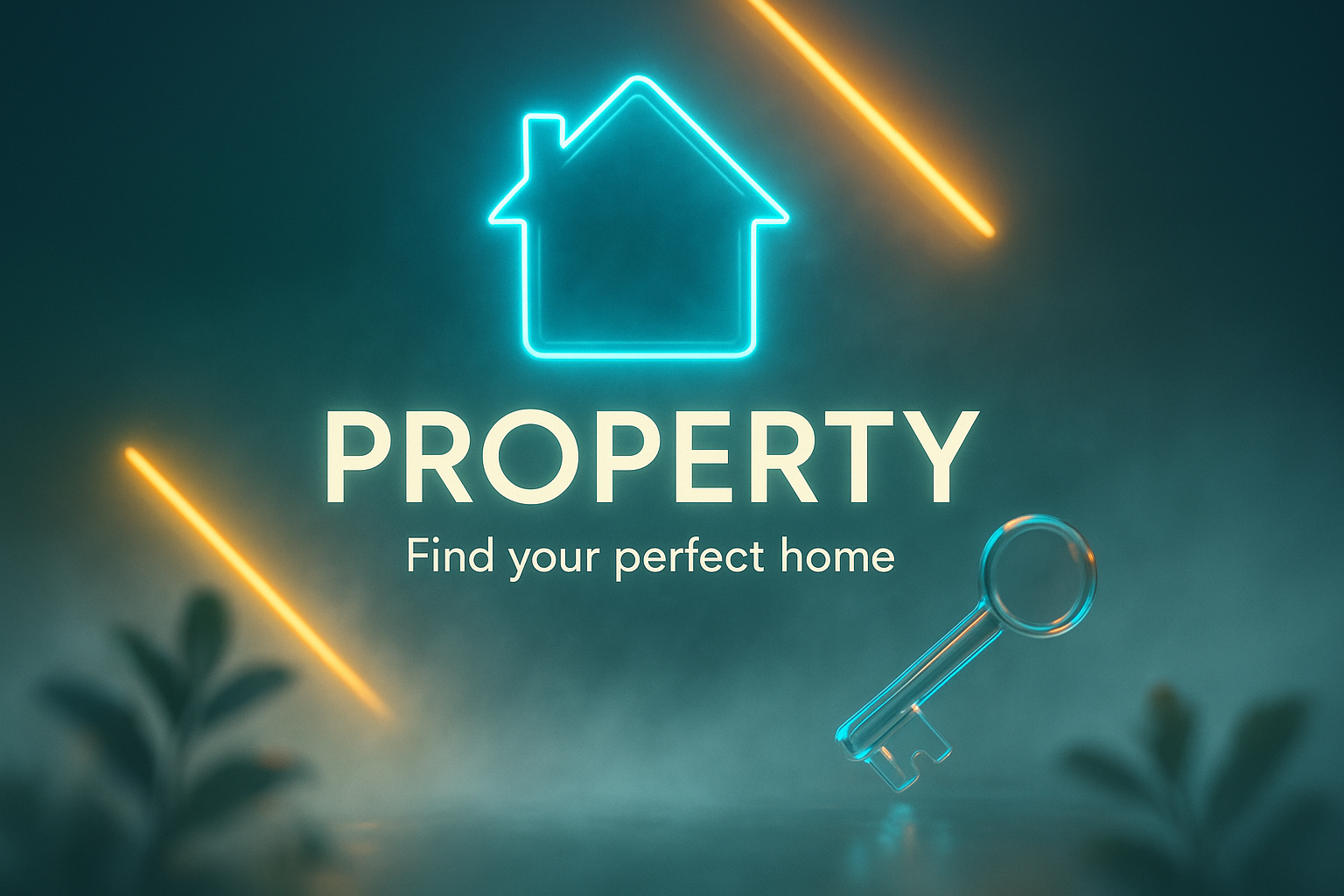 /Collection: /by davooda/Type: PNG/A visually striking advertisement featuring a glowing house icon and key, set against a misty background with neon accents. The text 'PROPERTY' and 'Find your perfect home' are prominently displayed.