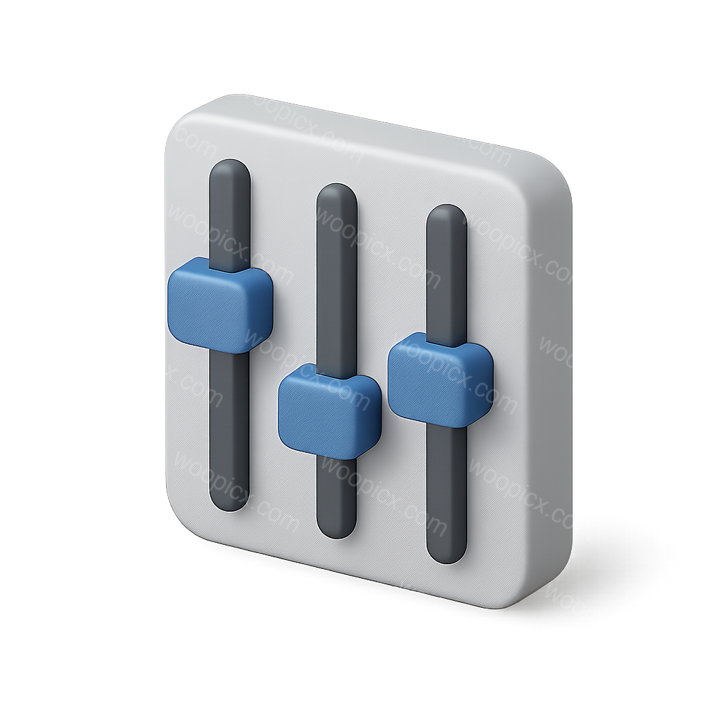 /Premium/Collection: /by davooda/Type: PNG/This image showcases a sleek 3D audio control slider icon with a transparent background. It features three adjustable sliders with blue knobs, presented in a three-quarter isometric view.