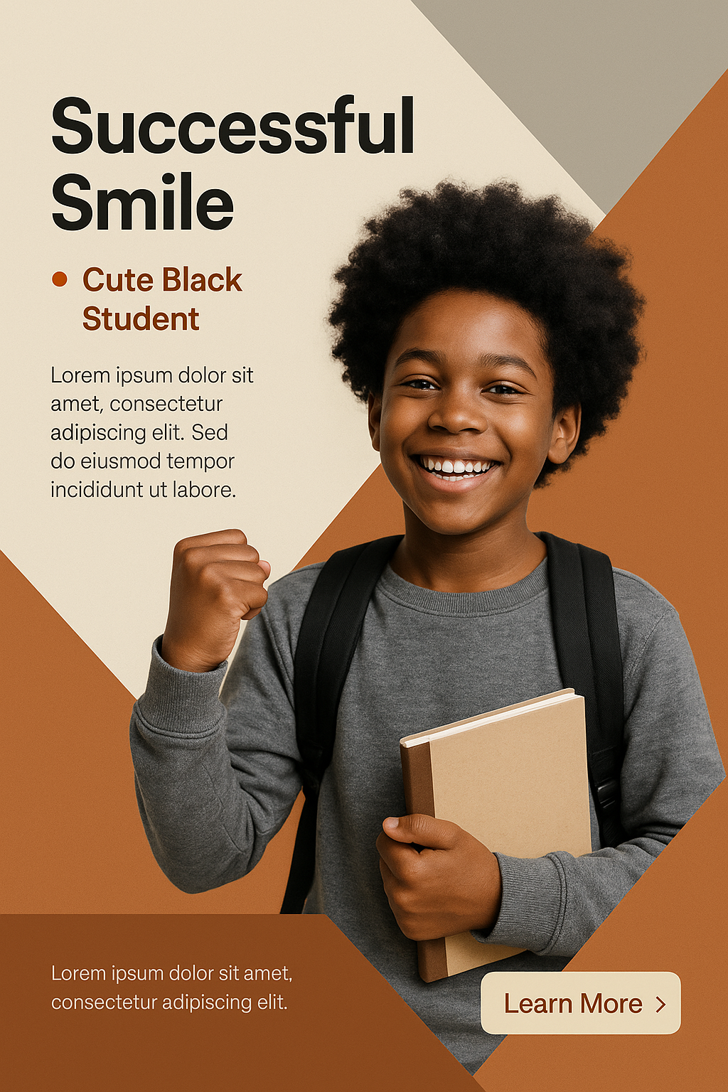 A vibrant portrait of a smiling black student holding a book against a geometric background. The design features a clear hierarchy and balanced composition.