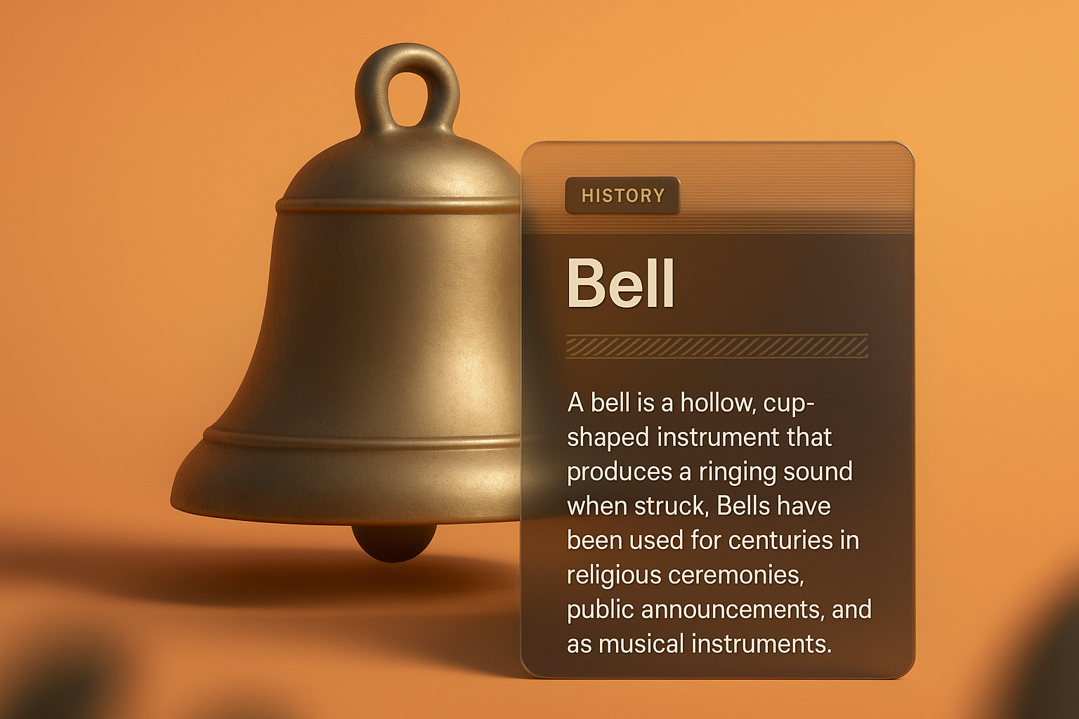The image features a 3D illustration of a bell set against a smooth gradient background. An informative overlay with text provides historical context about bells.