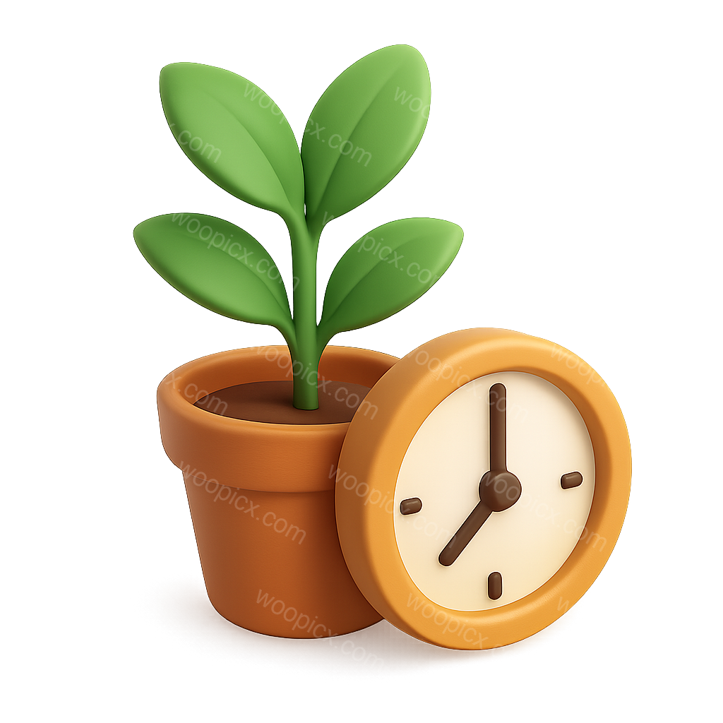 A 3D icon featuring a green plant with two leaves emerging from a brown pot, alongside a round clock. The clock has a classic design, highlighting the blend of nature and time.